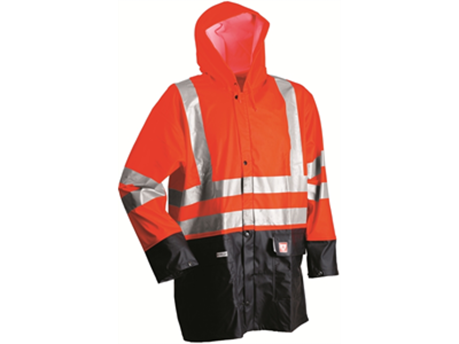Hi-Vis regnjakke i PU kvalitet - 50% Polyester og 50% Polyurethane (190 g/m²).
