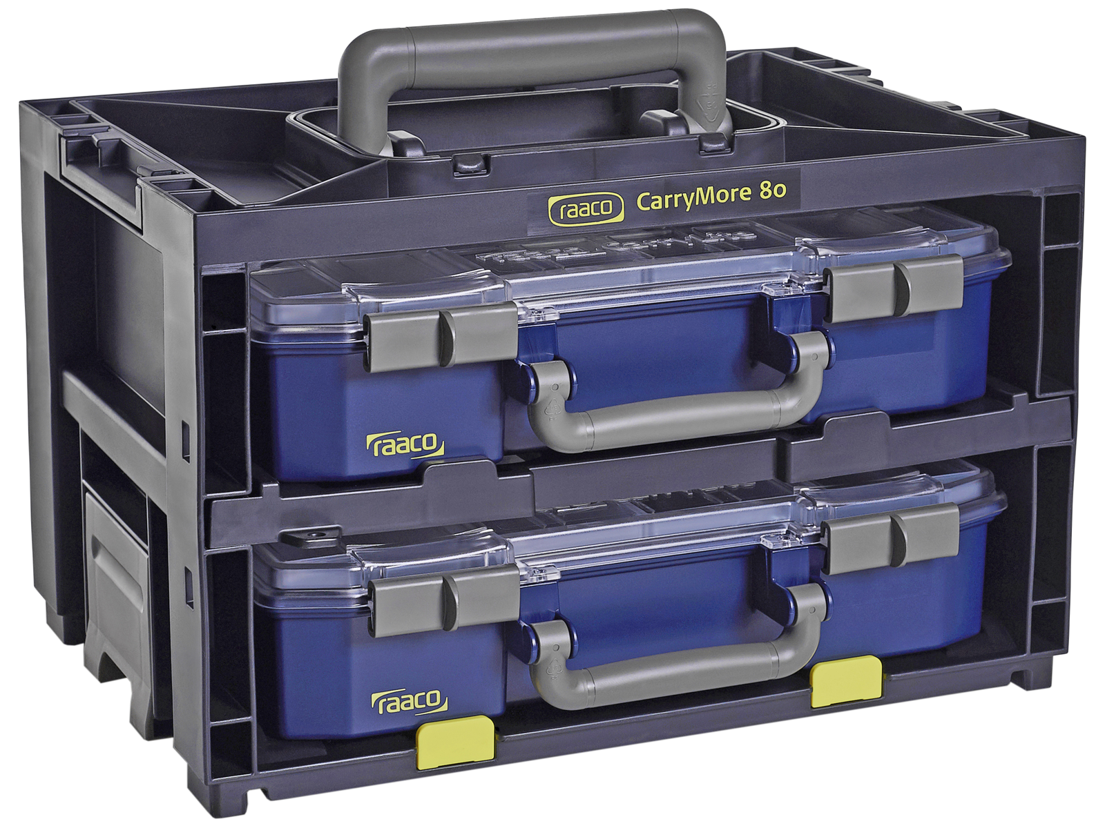 CarryMore opbevarings- og transportenhed med 2 stk. CarryLite 80 sortimentsæsker (4×8-9). CarryMore er udstyret med ergonomisk håndtag og sammenkoblingslås til at koble flere CarryMore sammen til en større enhed. Hyldestop forhindrer CarryLite æskerne i at falde ud under transport. Bæreevne 25 kg. Fremstillet af polypropylen og copolymer (PP og CO).