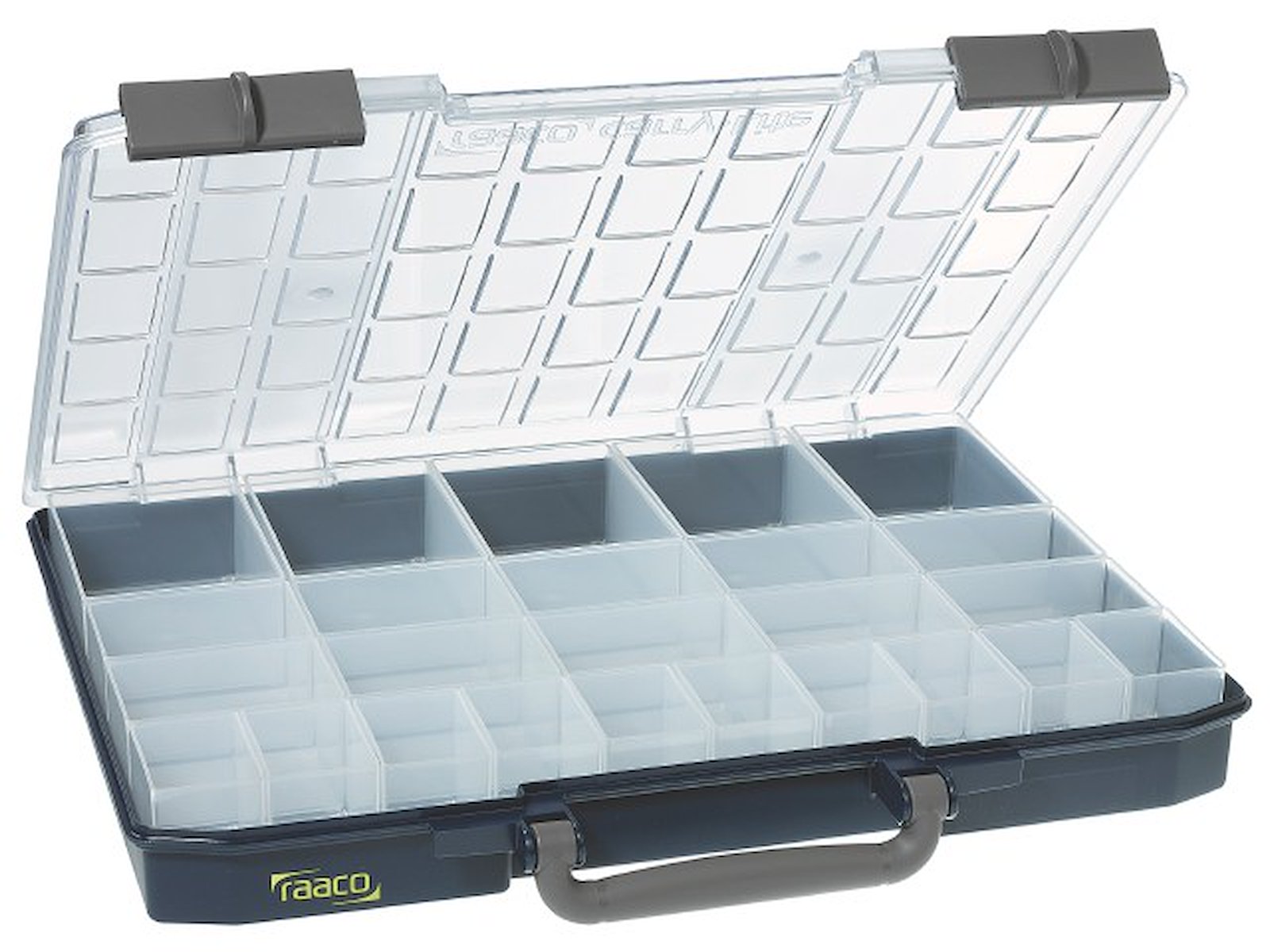 Sortimentsæske med 25 indsatse: 10 × A9-1, 10 × A8-1 , 5 × A7-1. Forsynet med 2 skydelåse og håndtag. Fremstillet af polypropylen (PP) samt stærkt låg af polykarbonat (PC).