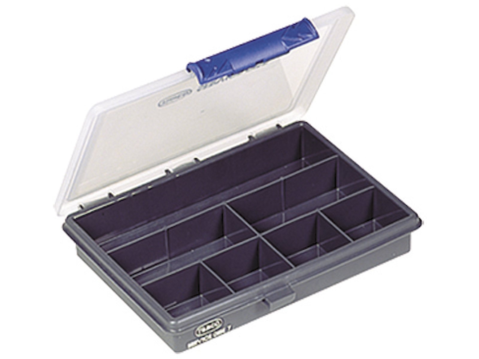 Sortimentsæske med 7 faste rum. Lukkes ved hjælp af skydelås.