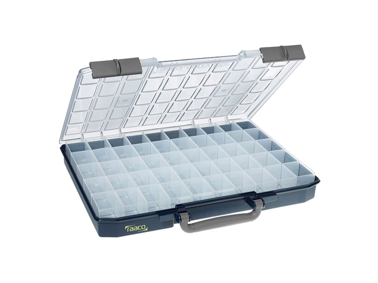 Sortimentsæske med 50 indsatse af typen A9-1. Forsynet med 2 skydelåse og håndtag. Fremstillet af polypropylen (PP) samt stærkt låg af polykarbonat (PC).