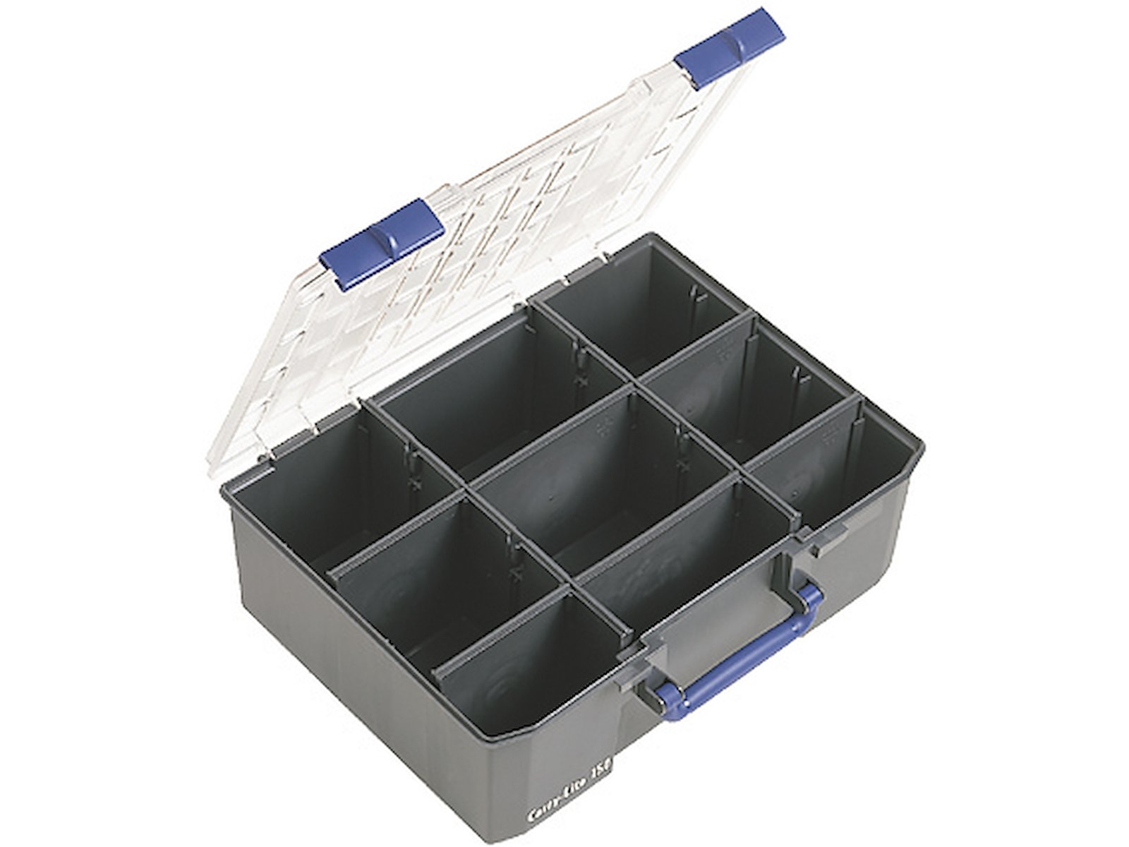 Dyb sortimentsæske med 8 flytbare skillevægge til ruminddeling. Forsynet med 2 skydelåse og håndtag. Fremstillet af polypropylen (PP) samt stærkt låg af polykarbonat (PC).
