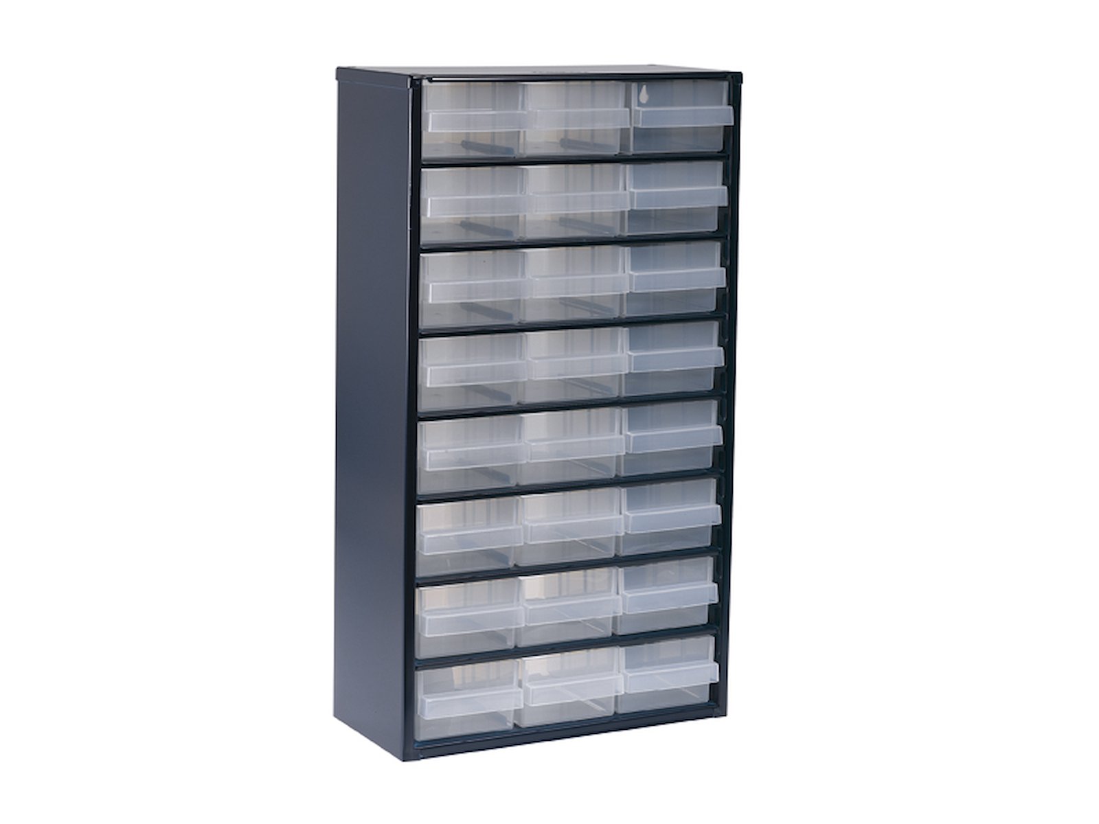 Med 24 skuffer af typen 150-02. Skufferne kan inddeles i 3 rum ved hjælp af skillevægge - ekstra tilbehør. Kabinet fremstillet af lakeret stål og skuffer af polypropylen (PP).