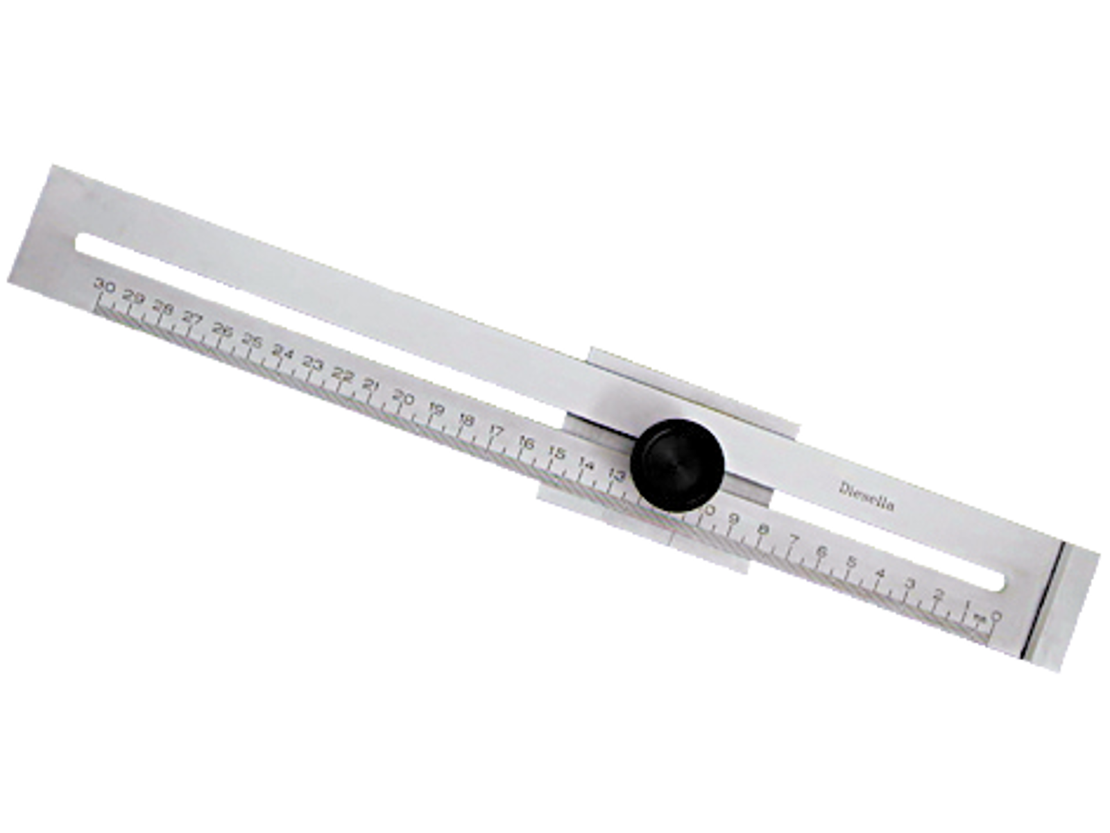 Fladt stregmål/opmærkningslære til opmærkning. Model med hærdet anlæg og matforkromet målestav og nonius. Stregmålet er desuden udstyret med kraftig spændeskrue og flade til ridsespids (40×6 mm). Anlægsflader 50×5 mm. Opmærkningsområde 0-300 mm, 0,1 mm aflæsning.