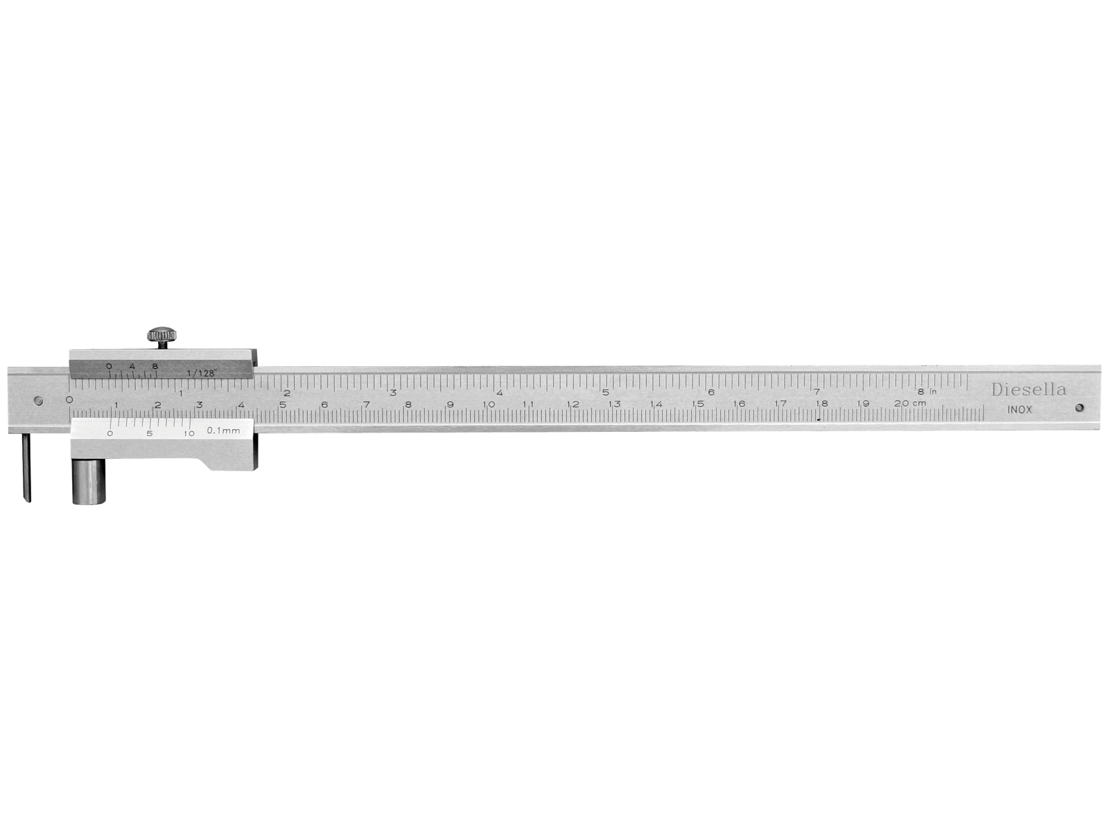 Ridsemål til opmærkning på plader. Målestav og nonius matforkromet. Med rulleleje som anlæg og udskiftelig ridsenål. 0,1 mm nøjagtighed. DIN 862 standard. Fås i flere varianter.