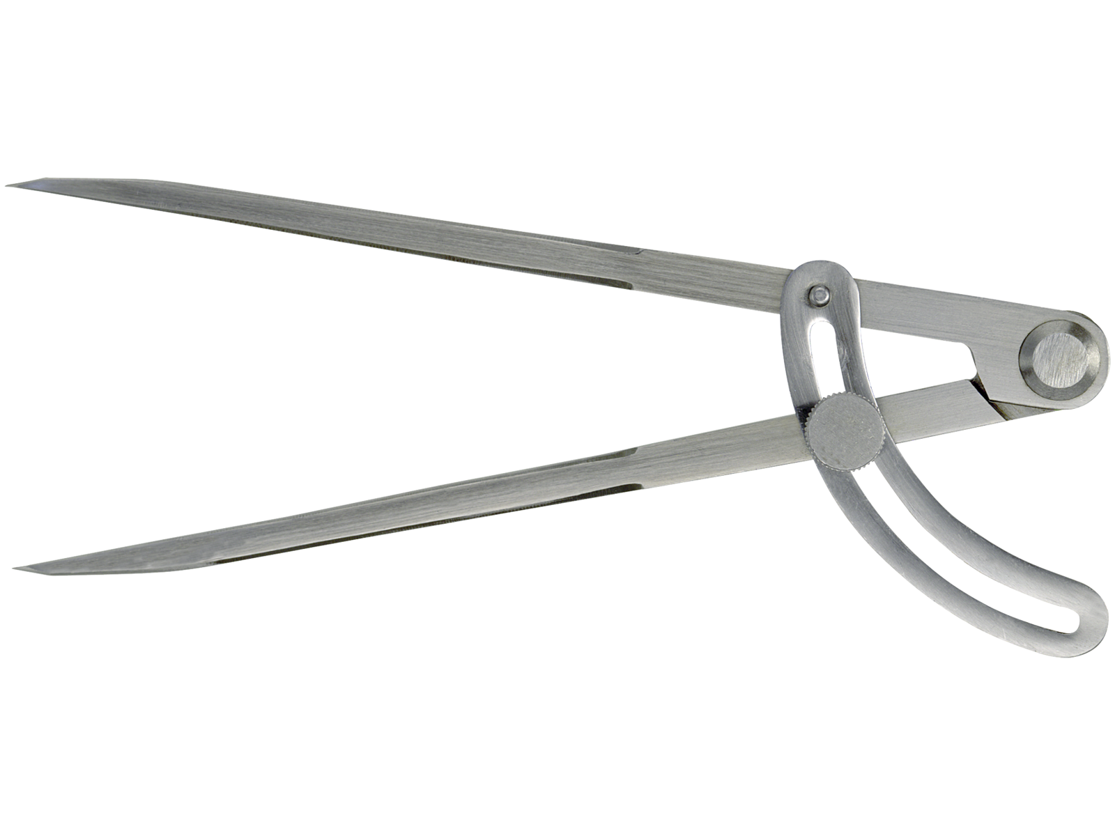 Stikpasser af stål med rektangulære ben og hærdede spidser. Med udvendig bøjle.