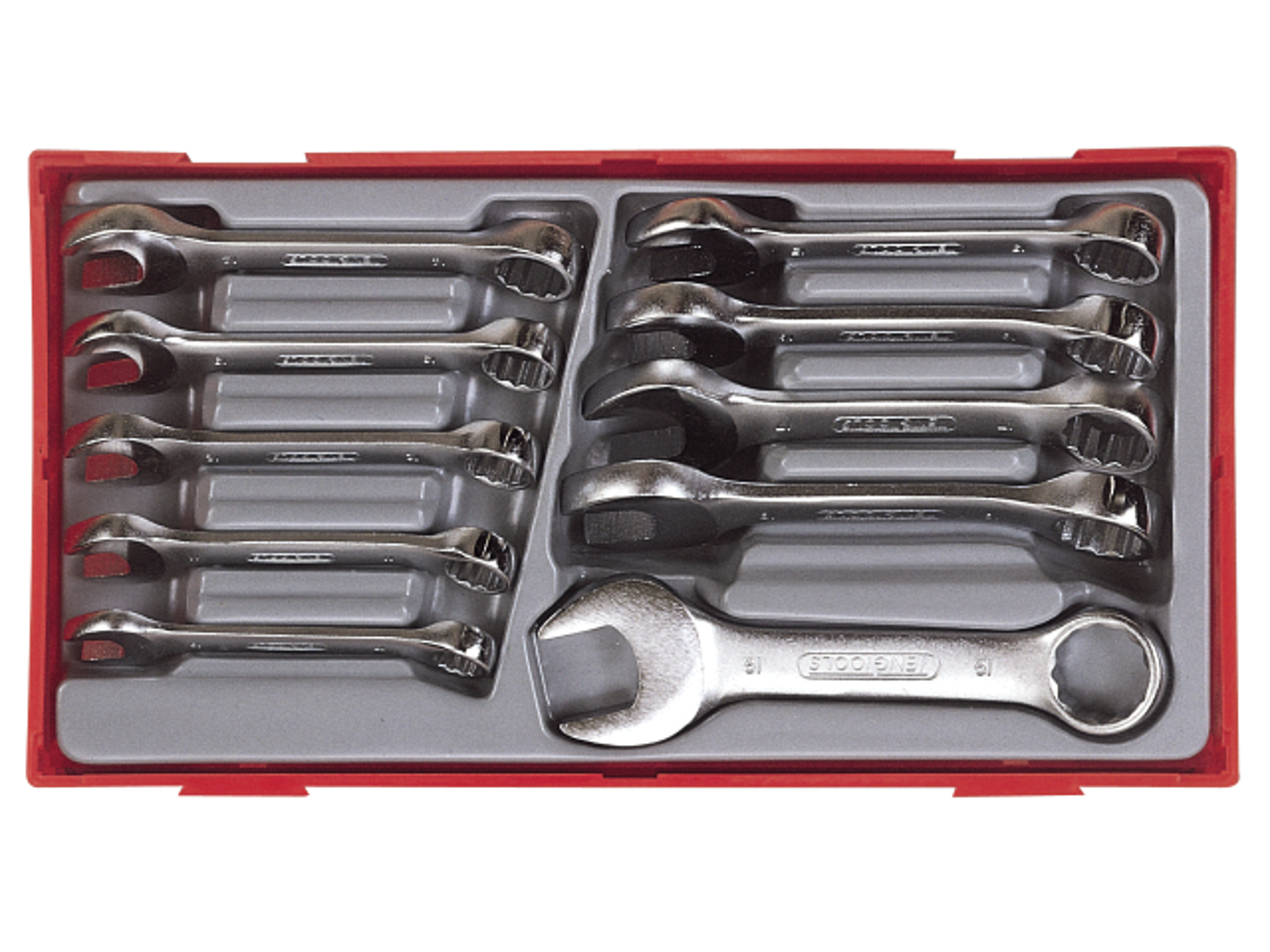 Stubby”-model. Korte nøgler af kromvanadiumstål. Samme dimension i begge ender. Det tolvkantede ringhoved er bukket i en vinkel på 15°. Forkromede.