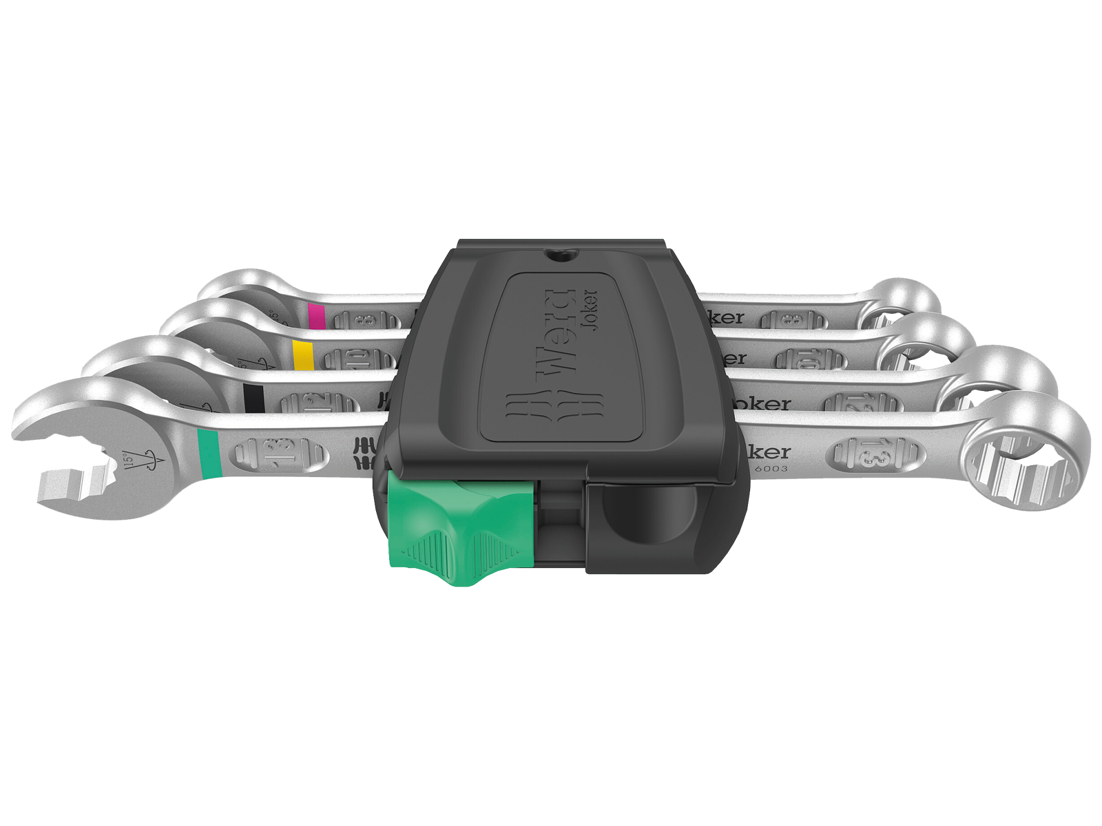 Joker ringgaffelnøglesæt med 4 dele. Joker ringgaffelnøgle med blot 15° returvinkel på gaffelsiden. Slank model med 15° vinklet ringside. Særligt velegnet til snævre forhold. Indeholder: 8×115 mm, 10×125 mm, 12×148 mm og 13×160 mm. Leveres i praktisk clips-holder, som sikrer gaffelnøglerne samtidig med at de er lette at tage ud.
