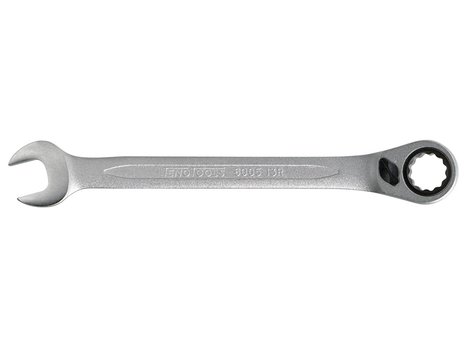 Ringgaffelnøgle med skralde af kromvanadiumstål. Kombineret fastnøgle og tolvkantet ringskraldenøgle. Skraldefunktionen kan omstilles til højre- og venstregang. Det tolvkantede ringhoved er bukket i en vinkel på 15°. Samme nøglevidde i begge ender. Matforkromet.