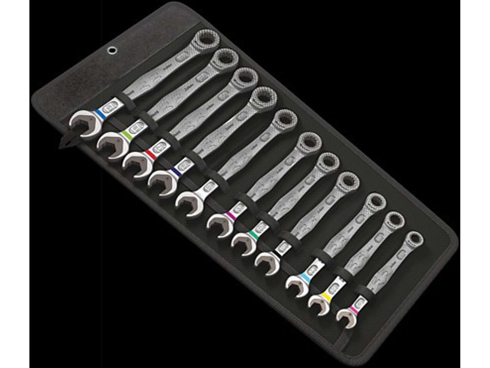 Kvalitets ringskralde-gaffelnøgle-sæt fra Wera. Sæt i 11 dele i robust taske. Til 6kt-skruehoveder og møtrikker. Med holdefunktion via metalplade i gaflen, der nedsætter faren for at tabe skruer og møtrikker. Den udskiftelige metalplade i gaflen fastholder med ekstra hårde tænder skruer og møtrikker og nedsætter faren for at rutsje af. Det integrerede slutanslag kan forhindre, at man rutsjer ned fra skruehovedet og muliggør pålægning af større momenter. Den dobbelte 6kt-geometri sørger for en formtilpasset forbindelse med skrue og møtrik og dermed for nedsættelse af faren for at rutsje af. En returvinkel på kun 30° på gaffelsiden hindrer tidskrævende venden nøglen om ved skruning. Skraldemekanik på ringsiden med usædvanlig høj finfortanding på 80 tænder giver fleksibilitet i snævre montagesituationer. Den specielle smedegeometri sørger for stor momentoverførsel og høj bøjningsstyrke. Fremstillet af højtydende krom-molybdæn-stål med nikkel-krom belægning for høj korrosionsbeskyttelse. M