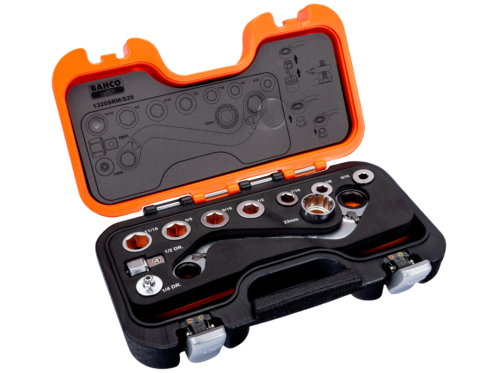 Ringskraldenøglesæt med 29 dele. Skraldenøgle 1320SRM-14-19 med arbejdsvinkel på 5° og omskifter til højre- og venstreomløb, adapter til 1/4"- og 1/2"-toppe med trykknap til hurtig udskiftning (quick release), adaptere til sekskantsskruer til dækning af størrelserne 8-17 mm og 5/16 - 11/16", adaptere til Torx-skruer til dækning af størrelser fra E8 til E22, samt gennemstikstop til størrelse 22 mm. Leveres i en kompakt HDPE-plastboks med T3 modulopbygget skumindlæg i to farver.