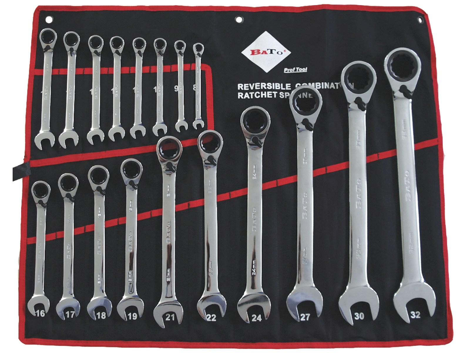 Ringskraldenøglesæt med 18 dele. Nøgler med omskifter og 15° vinkling. Sættet indeholder flg. dimensioner: 8 - 9 - 10 - 11 - 12 - 12 - 14 - 15 - 16 - 17 - 18 - 19 - 21 - 22 - 24 - 27 - 30 - 32 mm.