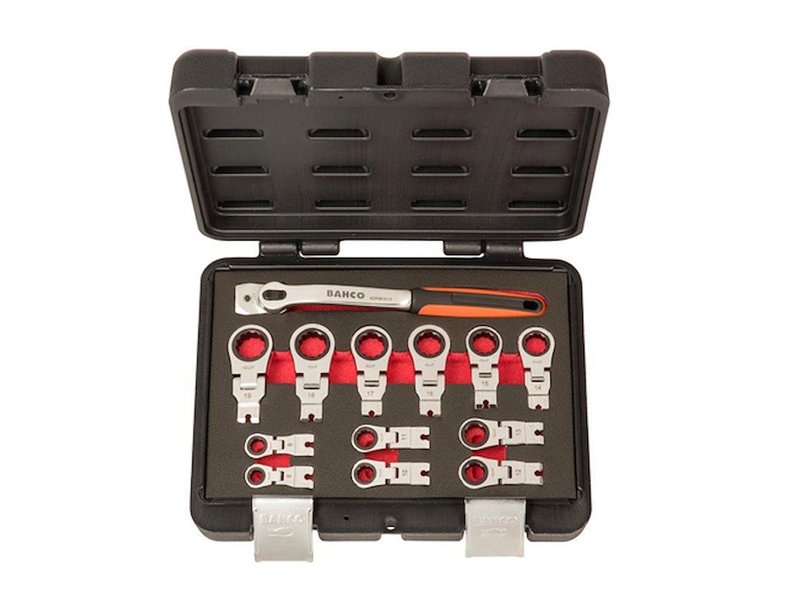 Justérbar ring-skraldenøgle i sæt 42RM/S12. Designet til at nå områder, der er svære at få adgang til. Med 2 justerbare/låselige led som kan vinkles op til 360° og 180°, hvilket giver mulighed for at arbejde på flere måder. 72 tænder/5° arbejdsvinkel med 12 belagte indsatser, i dimensionerne 8, 9, 10, 11, 12, 13, 14, 15, 16, 17, 18 og 19 mm. Hårdhed og momentkrav i henhold til ASME B107.66. Matpoleret finish. Højtlegeret stål. Leveres i en sprøjtestøbt kasse med skumindlæg for bedre værktøjsoverblik.