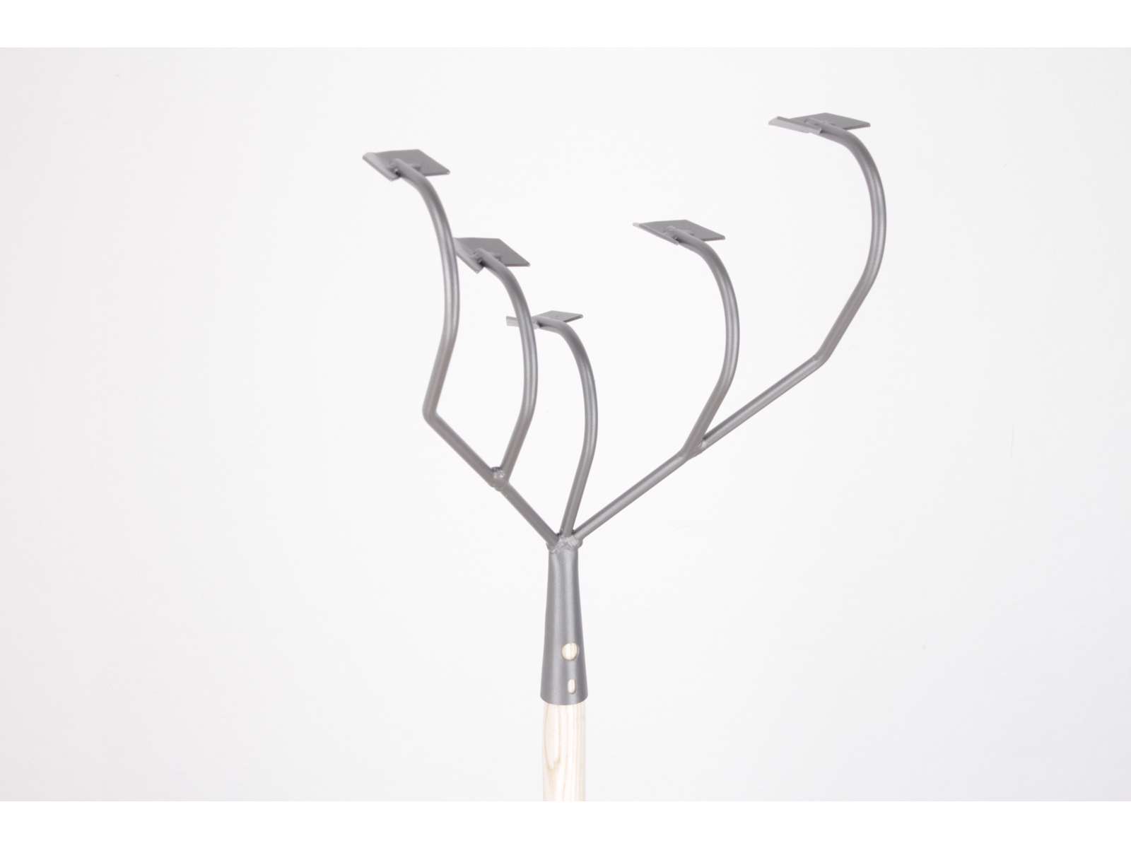 5-grenet kultivator til at fjerne ukrudt og til at lufte jorden, så frøene får ilt og mulighed for at spire. Model med lakeret asketræsskaft med D-greb i jern.