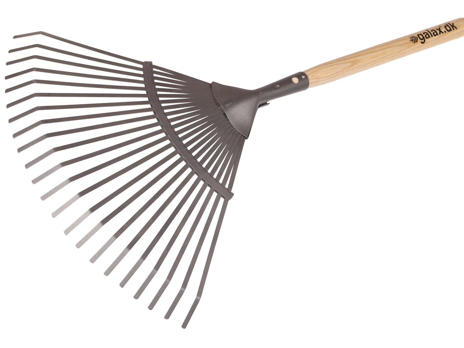 Løvrive med lakeret aksetræsskaft til at rive græsplænen fri for kviste og blade. Fås i flere varianter med både flade og runde tænder.