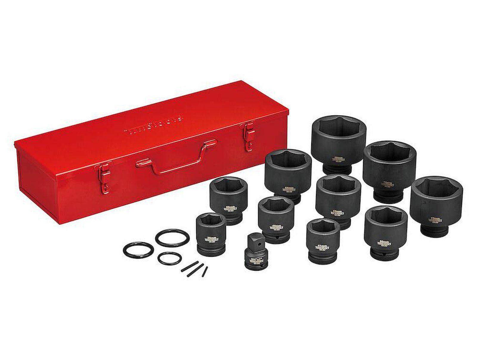 Slagtopsæt med 17 dele med 1'' firkantet fæste Teng Tools 9117 har 10 regulære metriske toppe fra 36 til 80 mm og en ¾ F x 1 M-adapter. Låsestifter (3 stk.) og ringe (3 stk.) medfølger. Fremstillet af krom-molybdænstål (CR-MO). Til brug med elværktøj. Leveres med metalkuffert. Udviklet og fremstillet iht. DIN3129.
