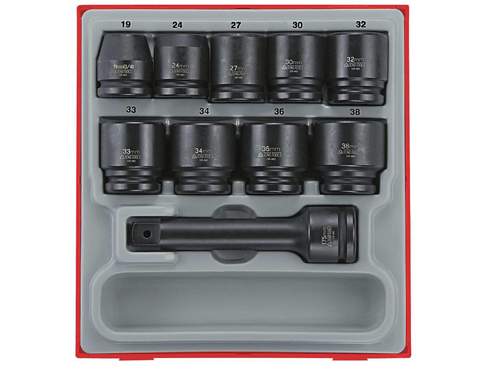 Sæt med 16 dele. Indeholder 9 stk. 3/4'' krafttoppe iht. DIN-standard, forlænger 175 mm, 3 stk. låseringe og 3 stk. låsestifter.