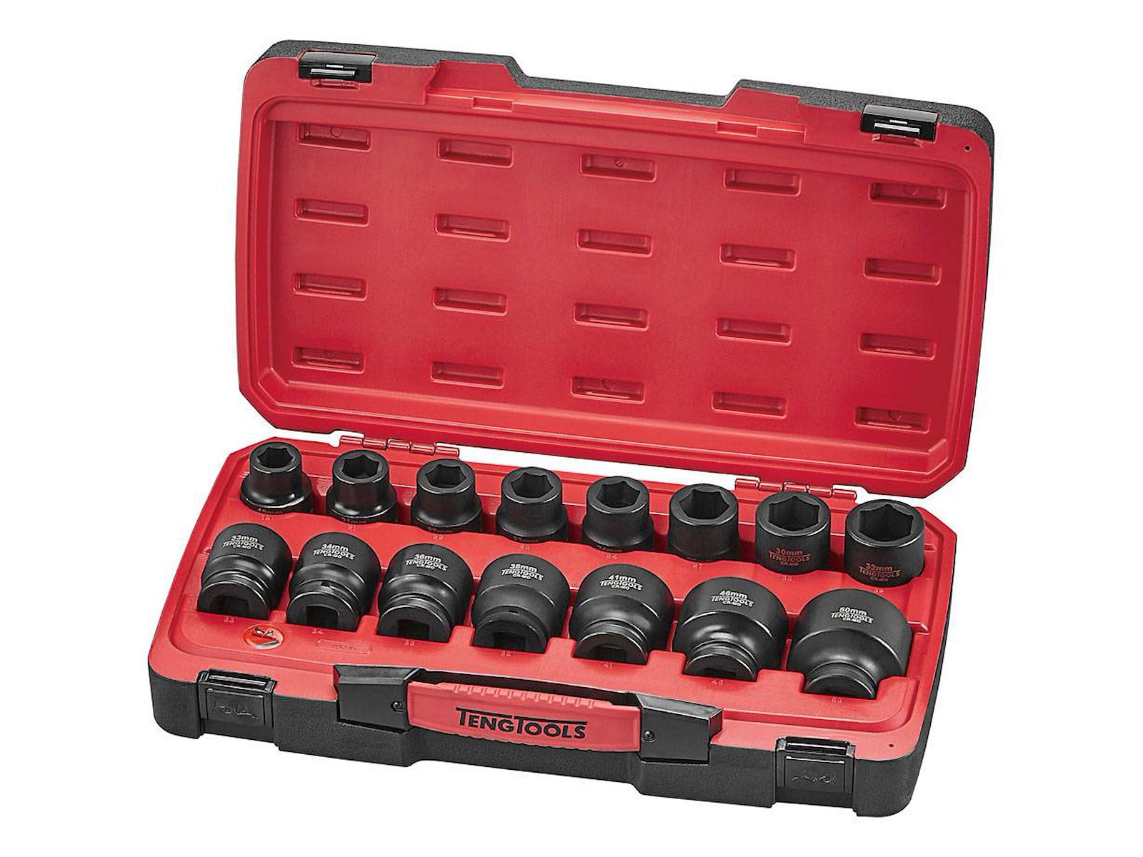 DIN-standarddesign til brug med låsestift og -ring. Krommolybdæn-stål til brug med elværktøj. Sort fosfatfinish for nem identifikation som en slagtop. Udviklet og fremstillet iht. DIN3129. Monteringsåbning med ring og stift i hundelen til fastgørelse af toppen. Monteringsring og stift er inkluderet i sættet. Leveres i slidstærk Teng Tools-kuffert med tydeligt logo. Toppenes åbenlyse placering gør det nemt at se, hvor de enkelte størrelser hører til.