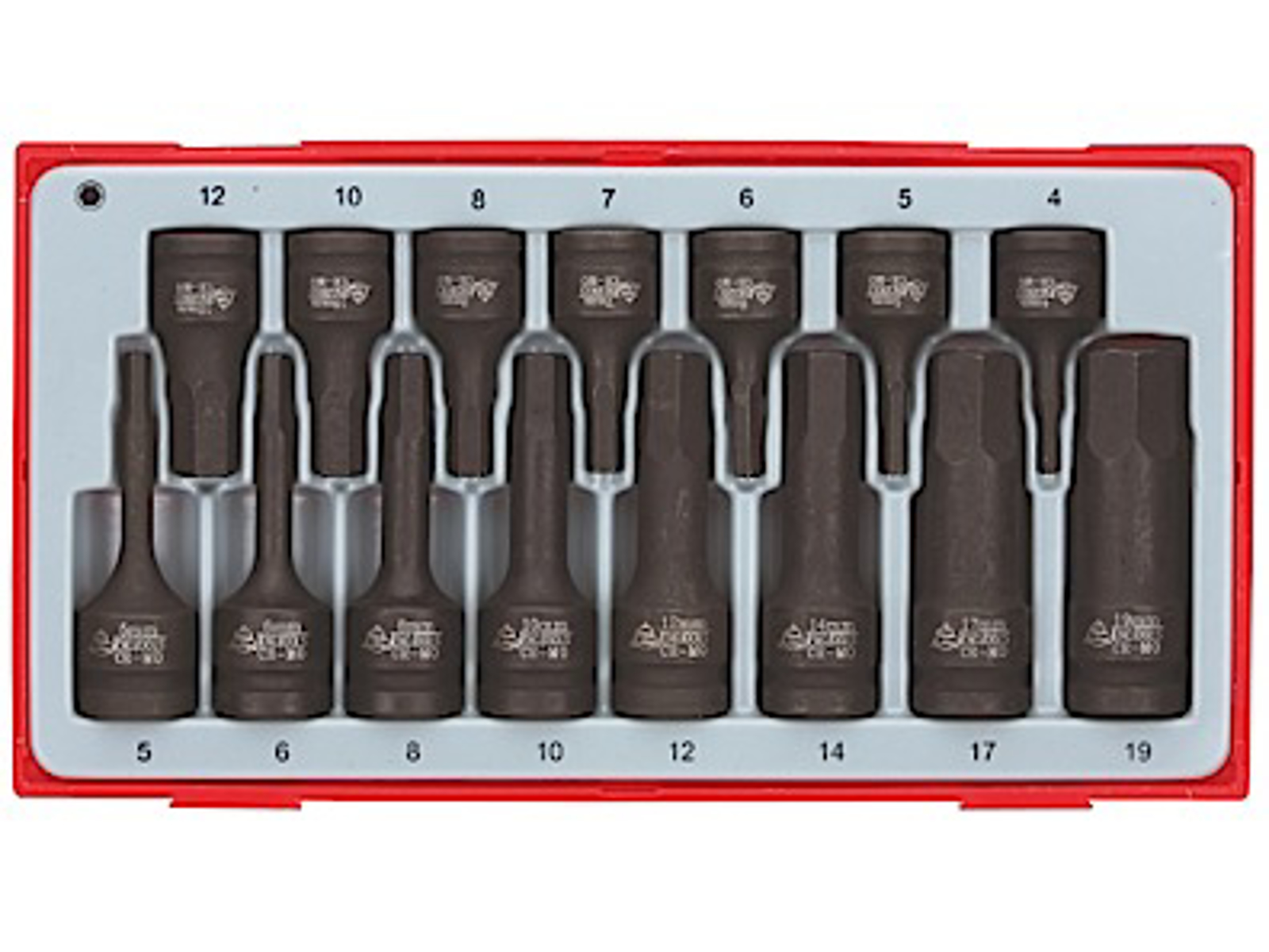 | Indhold | Krafttopbits til firkanthul 1/2", 5, 6, 8, 10, 12, 14, 17, 19 mm, Krafttopbits til firkanthul 3/8", 5, 4, 5, 6, 7, 8, 10, 12 mm |