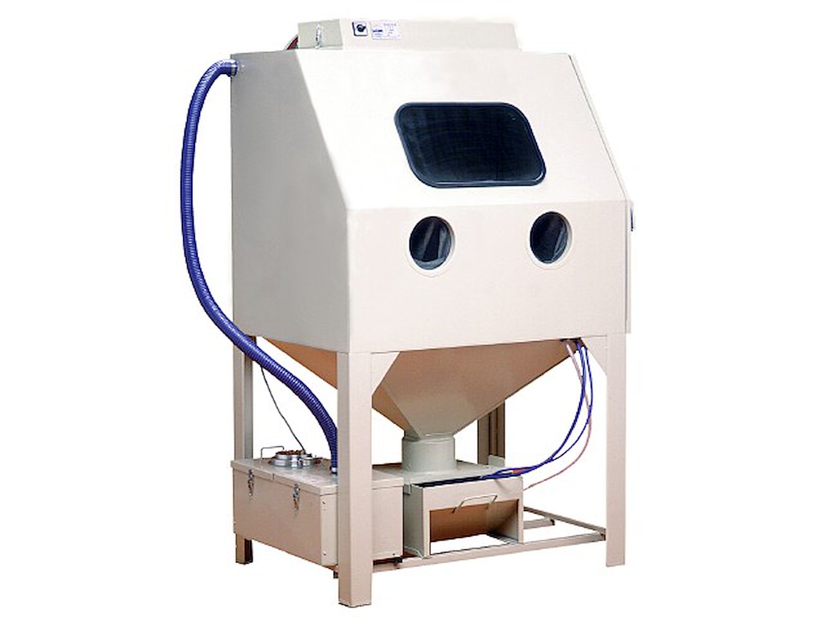 En blæsekabine komplet med støvudsugning indeholdende forfilter og mikrofilter samt et rengøringssystem til blæsemidlet. Kabinen har en stor observationsrude på 315x515 mm af 4 mm hærdet glas hvor operatøren har et særdeles godt udsyn over sin arbejdsopgave. Blæsepistolen er forsynet med en dyse af wolframkarbid med fodbetjening og sikkerhedsspærre samt en renblæsningspistol. Kabinen er med en stor sidelåge for nem i- og udtagning. Kabinens bund består af et arbejdsgitter hvor større partikler så som flager af rust og maling bliver liggende.