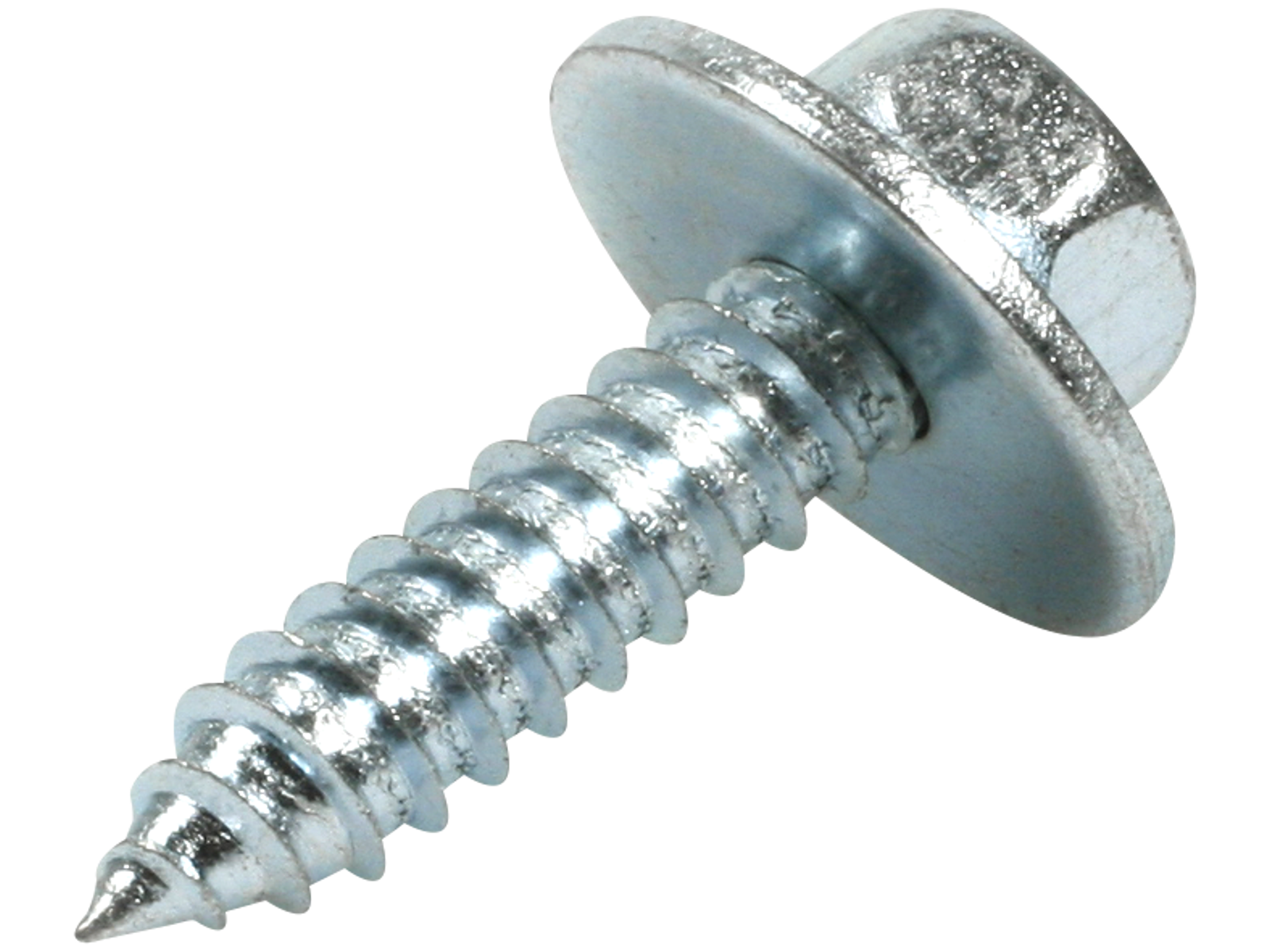 Gevindpressende skrue til metal med skarp spids, sekskantet hoved og plade. Metrisk gevind. Fås i flere varianter.
