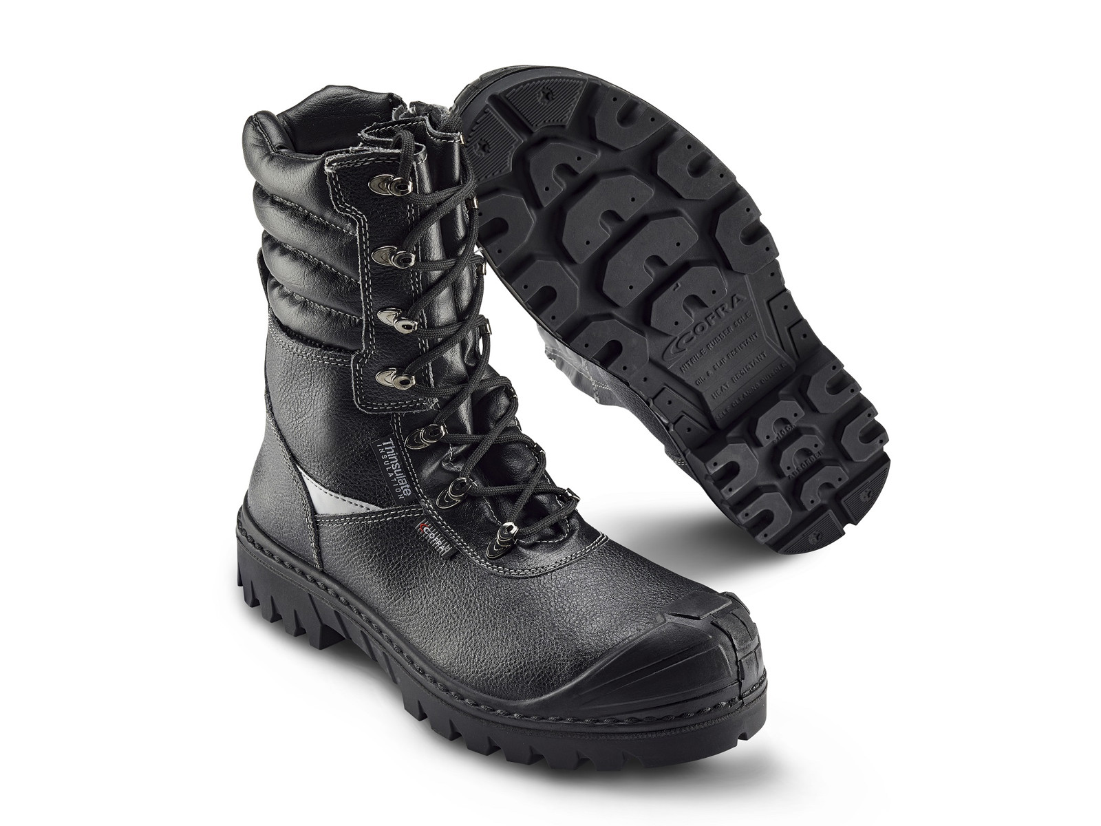 Af slidstærkt, åndbart og vandafvisende læder. Ekstra slidstærk, skridhæmmende og stødabsorberende ydersål af PU/nitrilgummi, som modstår varme op til 300 °C (HRO). Med en ekstra åndbar og slidstærk indlægssål samt ProNose for ekstra slidstyrke.