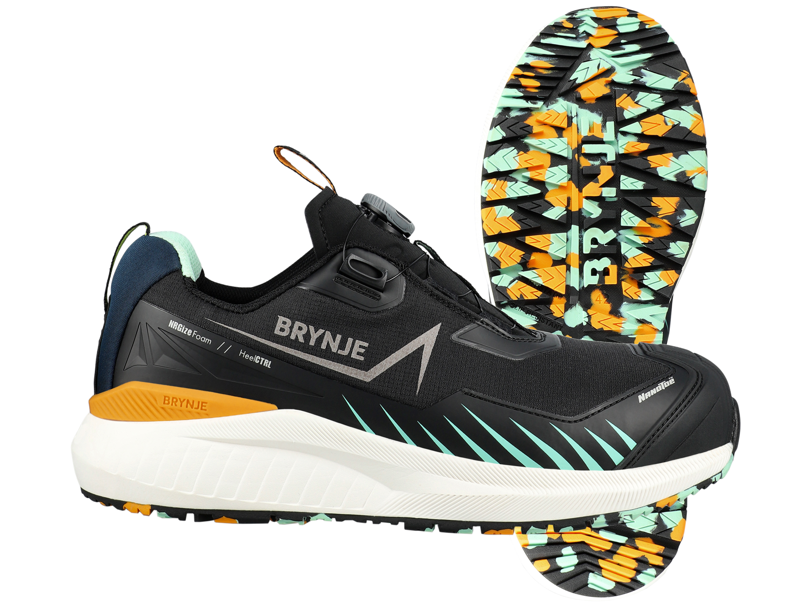 • Brynje Lab Textile lukket sikkerhedssko med hurtigluk og overdel af åndbart, vandafvisende og slidstærkt tekstil, hvoraf 30% er recycled. Innovativ sammensætning af sålen med ekstra NRGize Foam-indlæg for intens energireturnering. Slidstærk ydersål af gummi, mellemsål af EVA-skum. NRGize foam-indlæg sender energien fra hvert skridt tilbage til fødderne. En HeelCTRL-indsats stabiliserer hælen og bidrager til et godt fit. Med Boa Fit System og PrimeFIT-pløs for perfekt fit. Indlægssålen af recycled, upcycled og biobaseret PU-skum med et CoolMax-cover for optimeret åndbarhed og svedtransportering. NanoToe-tåværn, fibersømværn med kevlar-fibre godkendt til 3 mm søm. Godkendt ProNose i formstøbt TPU. Certificeret efter EN ISO 20345:2022 standarden. ESD-godkendt og PVC-fri. S3S SC SR FO.