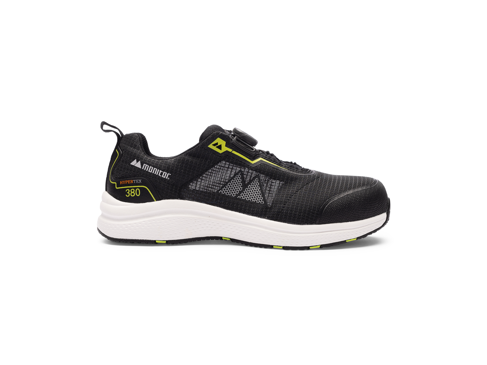 Three 100 Eighty er en let sikkerhedssko fra Monitor med tåværn i aluminium og Pantzar sømværn. Skoen har BOA® Fit System, Hypertex-overdel, EVA-mellemsål og ydersål i nitrilgummi. Velegnet til lager, industri og lettere byggeri.