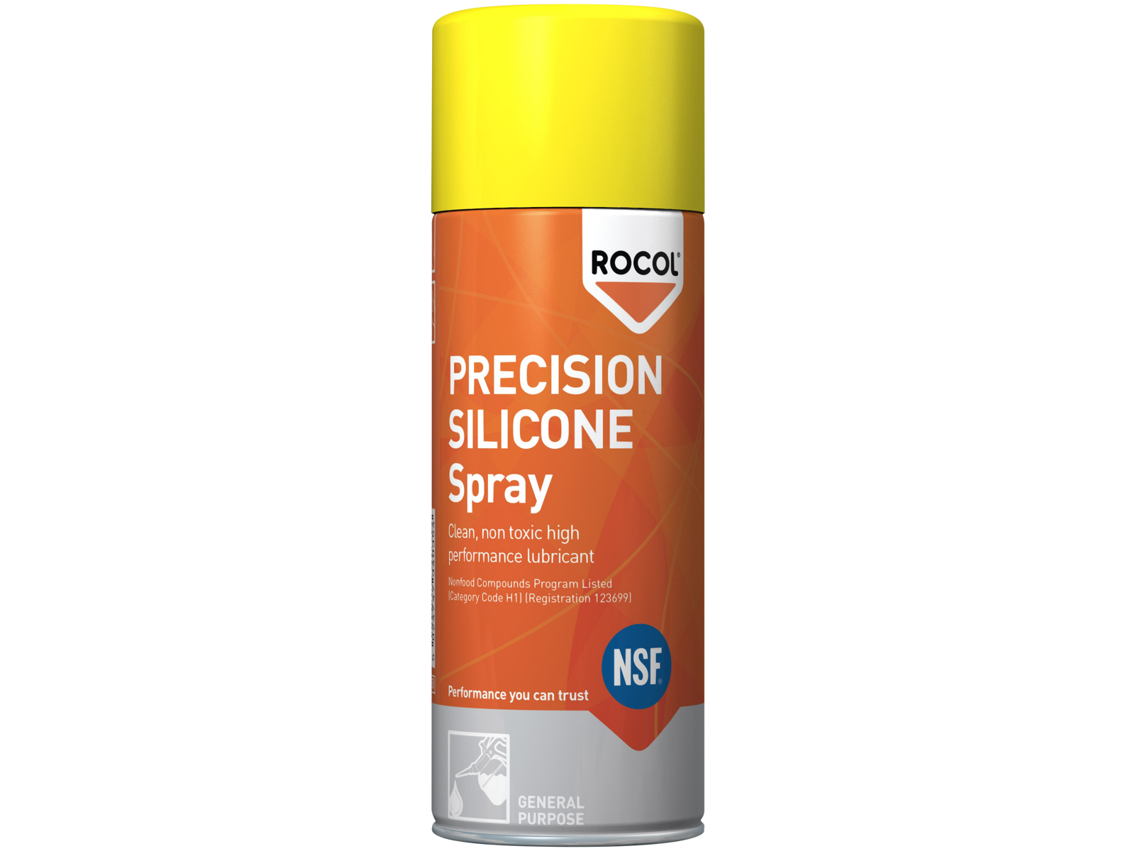 Rocol Precision silikonespray er baseret på en blanding af udvalgte silikoneolier. Produktet giver en ren, ugiftig, farveløs, ikke-plettende smørefilm. Produktet er stabilt over et meget stort temperaturområde fra -50°C til +200°C, besidder god elektrisk modstand, modvirker oxidation og korrosion. Precision silikonespray er specielt udviklet til fødevare-, kemikalie-, eller andre rene industrier hvor der foretrækkes en klar smørefilm med minimal overføring. Produktet giver en let smøring og er ideel til brug hvor almindelige silikonesprays giver problemer. Anvendes til smøring af slæder, lejer, conveyors mv. samt som slipmiddel til svejsekæber, støbeforme etc. Precision silikonespray er baseret på FDA-listede ingredienser og godkendt i henhold til NSF katagori H1. Anvendelse: Omryst aerosoldåsen kraftigt, hold denne lodret og påfør smøremidlet i en afstand af 15-30 cm. Sørg for god ventilation. Spray ikke imod åben ild eller glødende materiale.