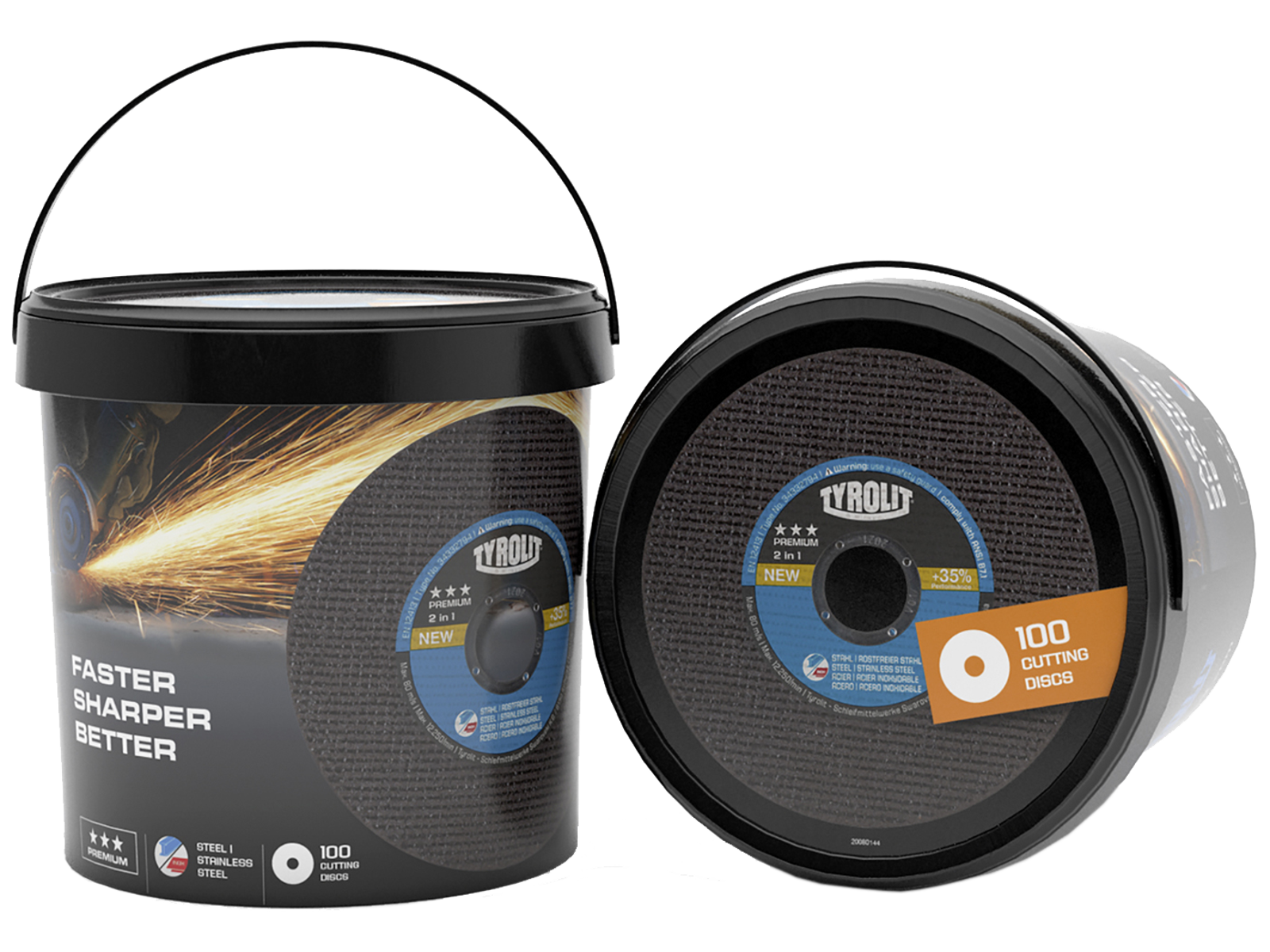 Supertynde Premium 2-i-1 skæreskiver til stål og rustfrit stål. Til skæring af metalplader, profiler, rør, stænger og massivt materiale. Giver en højere ydelse og kraftig reduceret værktøjsslitage. Spand med 100 stk.
