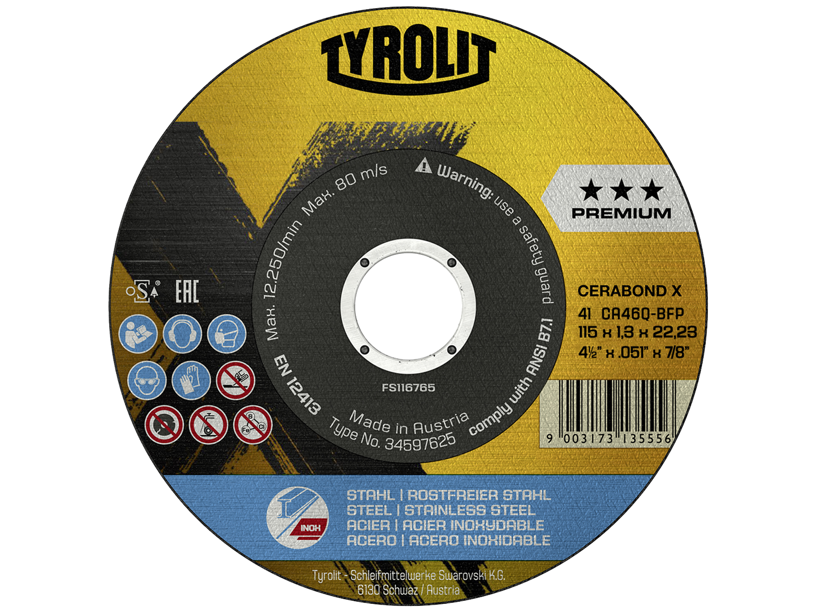 Premium*** Cerabond X skæreskive til stål og rustfrit stål. Til bearbejdning af forskellige stål- og rustfri stålkvaliteter, til skæring af meget hårde, udfordrende og solide emner. 1,0 til 1,6 mm anbefales til hurtig skæring og minimal gratdannelse - 2,0 mm anbefales til lang levetid og maksimal stabilitet. Skiven giver de bedste resultater ved brug på kraftige vinkelslibere. Fås i flere varianter.