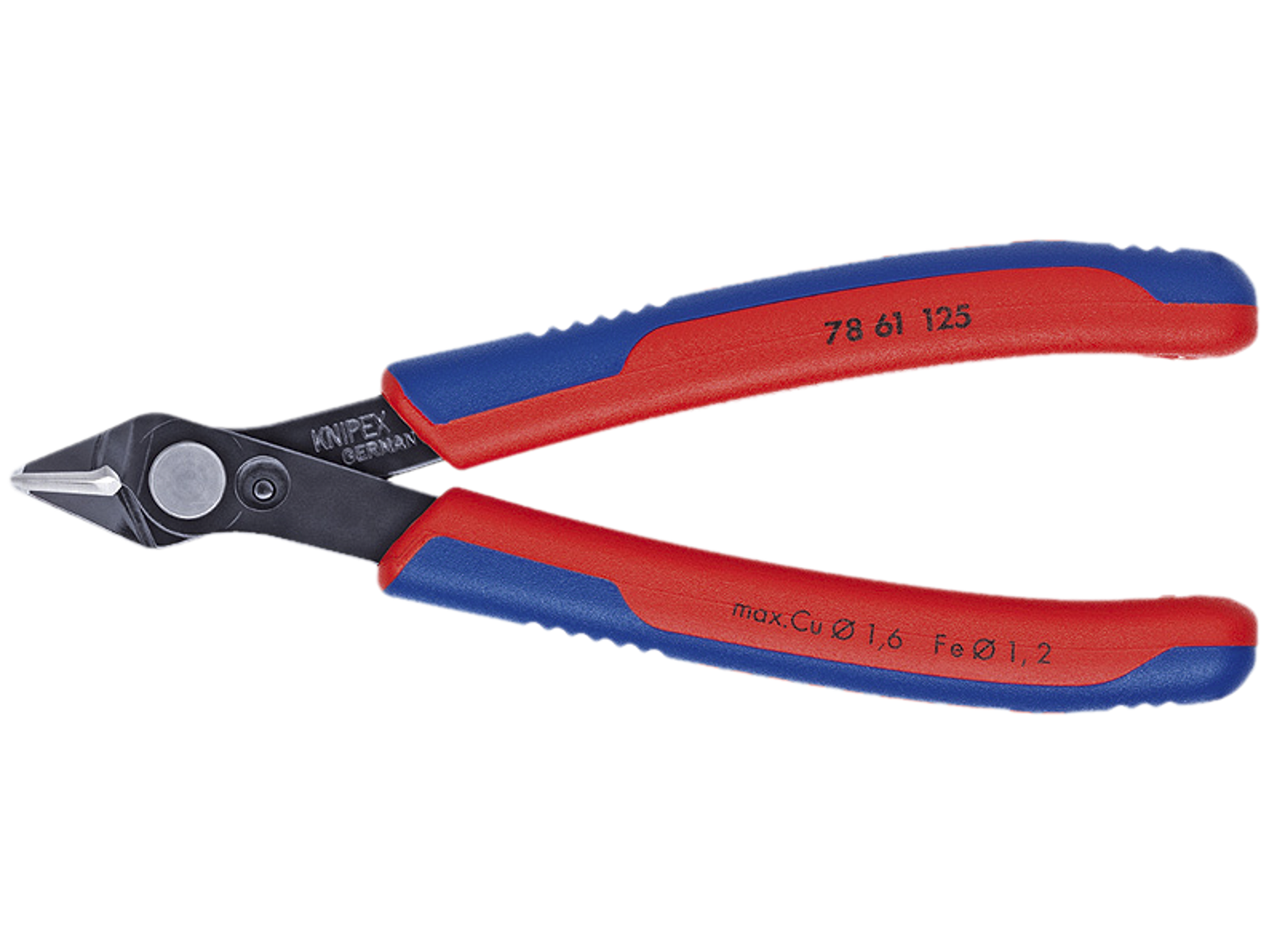 Electronic Super Knips bruneret med flerkomponent-håndtag 125 mm. Præcisionstænger for fineste skærearbejder, f.eks. inden for elektronik og finmekanik. Slebne, særdeles skarpe skær uden facet, til plan afskæring. Præcist formede spidser, skærer også tæt liggende tråde fra Ø0,2 mm. Led med rustfri stålnitte. Skær yderligere induktivt hærdet. Går ekstremt let, så arbejdet ikke udmatter. Med åbningsfjeder og åbningsbegrænsning. Af INOX eller special-værktøjsstål. Skær yderligere induktivt hærdede, skærhårdhed ca. 64 HRC. Også egnet til at skære glasfiberkabler (lysbølgeledere).