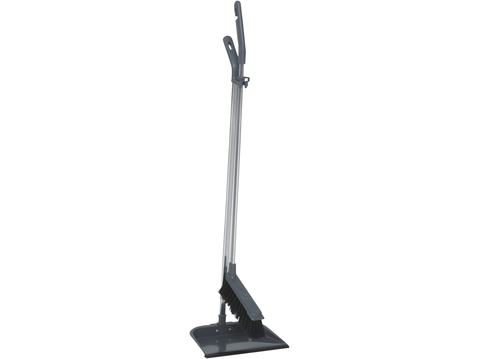 Langskaftet fejebakke i metal med gummilæbe. Fejesæt inkl. kost, til hurtigt og enkelt at fjerne snavs fra gulvet uden at skulle bøje sig.