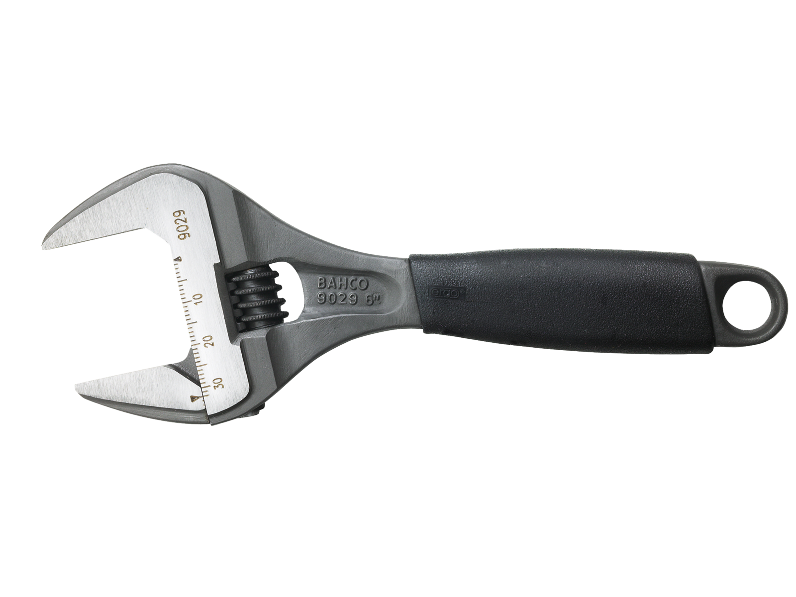 Serie 90 Ergo skiftenøgle/"svensknøgle" med ekstra stor kæbeåbning og kortere håndtag end på standardnøgler giver bedre mulighed for arbejde hvor pladsen er trang. Form A, 15° vinkel. Venstregående skrue. Parallelle gribeflader med 15° vinkel giver et fast greb og god adgang hvor pladsen er trang. Kæben falder ikke ud - selv når nøglen er maksimalt åben. Laserskala i mm til forudindstilling og præcis måling. Slankt hoveddesign og ergonomisk komforthåndtag. Håndtaget føles aldrig for varmt eller for koldt og modstår olier og fedt.