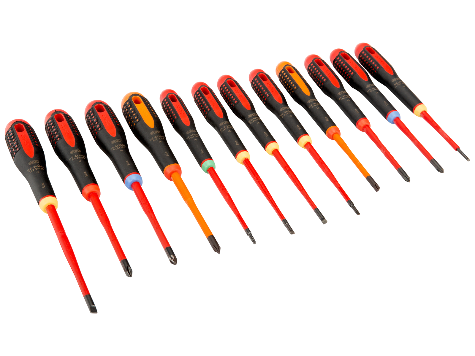VDE-skruetrækkersæt med 12 dele til ligekærv, Phillips, Pozidriv, Torx og Combi-PH skruer. Skruetrækkere med tynd klinge (reduceret klingediameter) og spids med fosfateret finish, som giver højere nøjagtighed, præcis pasform og ingen afskalning. Skruetrækkerne er udviklet iht. Ergo-programmet: 3-komponent håndtag for maksimal brugervenlighed, blødt materiale med nubret overflade, der sikrer et ergonomisk godt greb og større kraftoverførsel. Det er nemt at vælge den rigtige kærv med hjælp fra det farvekodede håndtag og permanente symbol på enden af håndtaget. Derudover med flade sider for at forhindre rulning og integreret ophængshul. Til arbejde under spænding op til 1.000 V - Individuelt kontrolleret og fremstillet iht. IEC 60900, testet i et vandbad ved 10.000 V. Sættet indeholder: ligekærv 0,4×2,5×75 mm / 0,8×12×200 mm/ 1×5,5×125 mm / 0,5×3×100 mm/ 0,6×3,5×100 mm, Phillips PH1 / PH2, Pozidriv PZ1 / PZ2, Torx TX10, og Combi ligekærv/Phillips 5 mm×PH1 / 6 mm×PH2.