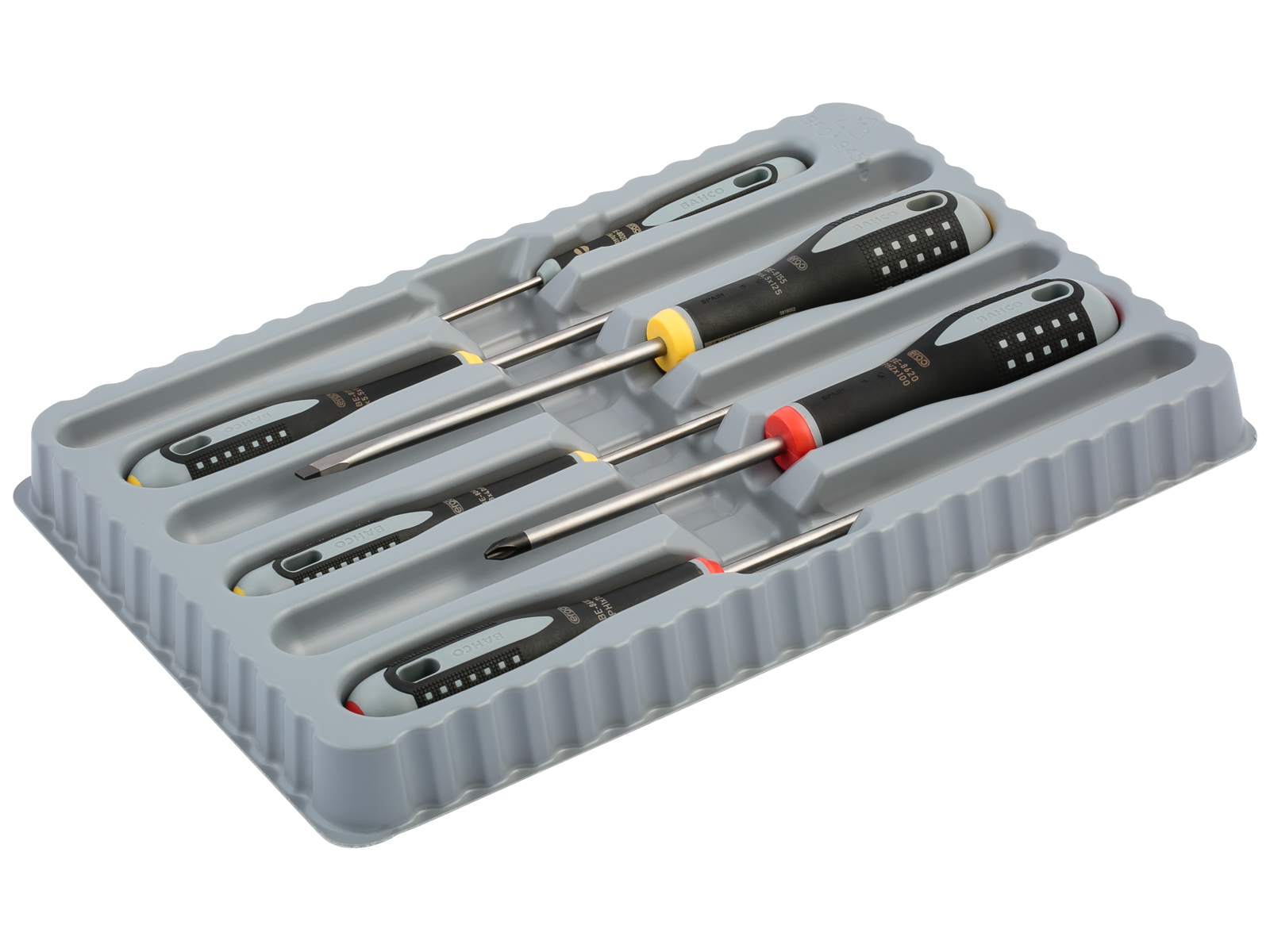 Ergo skruetrækkersæt med 6 dele til ligekærv og Philips. Skruetrækkere med fosfateret spids og højtlegeret stålklinge, forkromet og helhærdet. 3-komponent håndtag af blødt materiale med nubret overflade for et godt greb og højere vridmoment. Asymmetrisk design sikrer skruetrækkeren fra at rulle væk fra arbejdsstedet. Nemt at vælge den rette spids med det farvekodede skaft og permanent symbol i den kugleformede ende. Sættet indeholder: ligekærv: 0,5 × 3 mm / 0,8 × 4 mm / 1 × 5,5 mm / 1,2 × 6,5 mm, Philips: PH1 / PH2. Leveres i papæske.