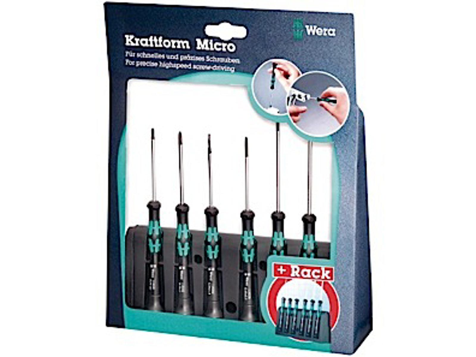 Kraftform Micro elektronik-skruetrækkersæt med 6 dele - til Philips og ligekærv. For fx. for elektronik-teknikere, optikere, finmekanikere, juvelerer, IT-hardwaremontører eller modelbyggere. Flerkomponent Kraftform Micro greb med præcisionszone direkte ovenfor klingen, kraftzone med integrerede bløde zoner for overførsel af store løsnings- og spændingsmomenter, og hurtigdrejezone nedenfor den drejelige kappe for lynhurtig snurren rundt. Black Point spids garanterer lang brugstid for spidsen, forøget korrosionsbeskyttelse og eksakt pasform. "Take it easy"-værktøjsfinder: Farvemærkning efter profiler og størrelse. Sekskantet rullestop forhindrer skruetrækkeren i at rulle væk på arbejdsstedet. Sættet indeholder: Philips: PH00 × 60 mm / PH0 × 60 mm, ligekærv: 0,3 × 1,8 × 60 mm / 0,4 × 2 × 60 mm / 0,4 × 2,5 × 80 mm / 0,5 × 3 × 80 mm. Leveres med praktisk rack/holder til opbevaring.