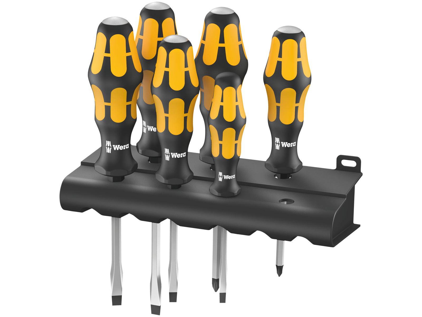 Kraftform Plus Serie 900 skruetrækkersæt med 6 dele - til Pozidriv og ligekærv. Skruemejsle til at skrue, mejsle, stemme med - med slagkappe og sekskant til fastnøgle til overførsel af større momenter. Kraftform grebet giver mulighed for stor kraftoverførsel via de skridsikre bløde områder og høj arbejdshastighed via de hårde områder på grebet. Gennemgående sekskantklinge med Black Point spids for præcision og optimeret korrosionsbeskyttelse. Sekskantet rullestop forhindrer skruetrækkeren i at rulle væk på arbejdsstedet. Sættet indeholder: Pozidriv: PZ1 × 80 mm / PZ2 × 100 mm, ligekærv: 0,6 × 3,5 × 80 mm / 0,8 ×4,5 × 90 mm / 1 × 5,5 × 100 mm / 1,2 × 7 × 125 mm, samt rack/hylde til opbevaring.