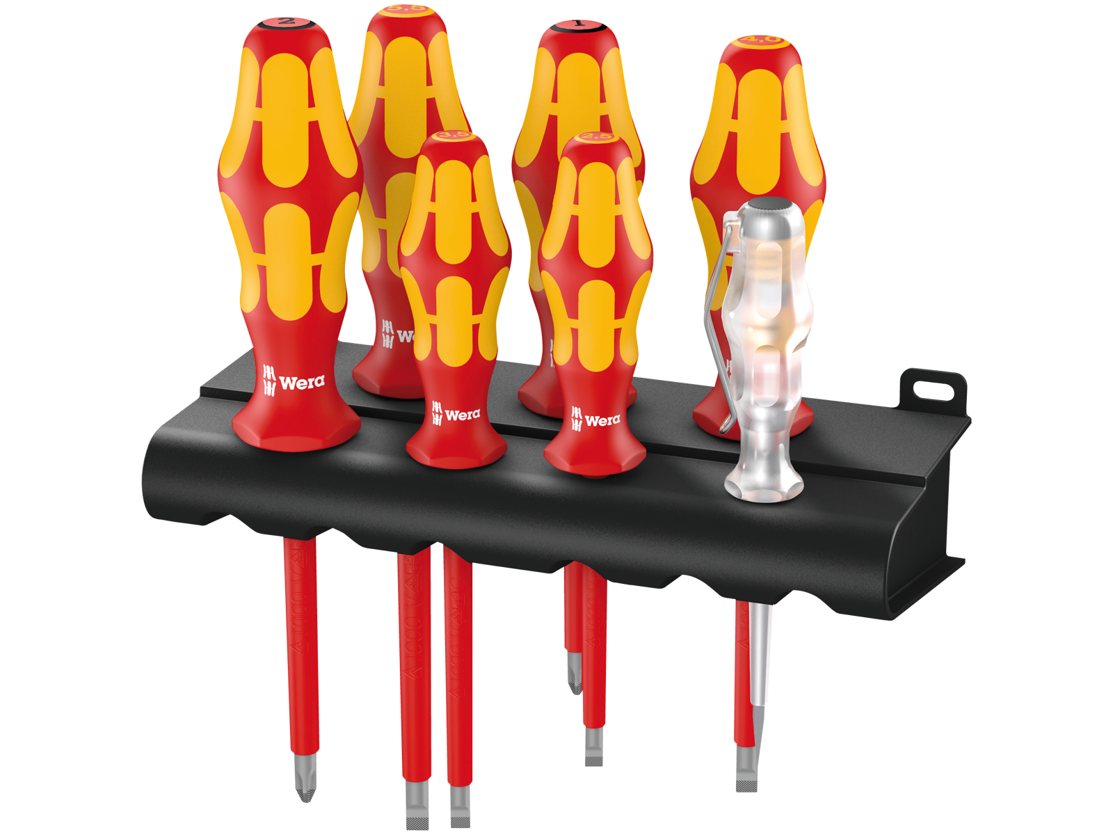 Kraftform Plus Serie 100 VDE skruetrækkersæt med 7 dele - til Pozidriv og ligekærv. Skruetrækkere enkeltvis testet ved 10.000 V iht. IEC 60900 - garanterer sikkert arbejde ved spændinger op til 1.000 V. Kraftform grebet giver mulighed for stor kraftoverførsel via de skridsikre bløde områder og høj arbejdshastighed via de hårde områder på grebet. Korrosionsbeskyttede klinger med Lasertip, som bider sig fast i kærven og forhindrer, at skruetrækkeren smutter ud. "Take it easy"-værktøjsfinder: Farvemærkning efter profiler og størrelse. Sekskantet rullestop forhindrer skruetrækkeren i at rulle væk på arbejdsstedet. Sættet indeholder: Pozidriv: PZ1 × 80 mm / PZ2 × 100 mm, ligekærv: 0,4 × 2,5 × 80 mm / 0,6 × 3,5 × 100 mm / 0,8 × 4 × 100 mm / 1 × 5,5 × 125 mm, spændingssøger 0,5 × 3 × 70 mm, samt rack/hylde til opbevaring.