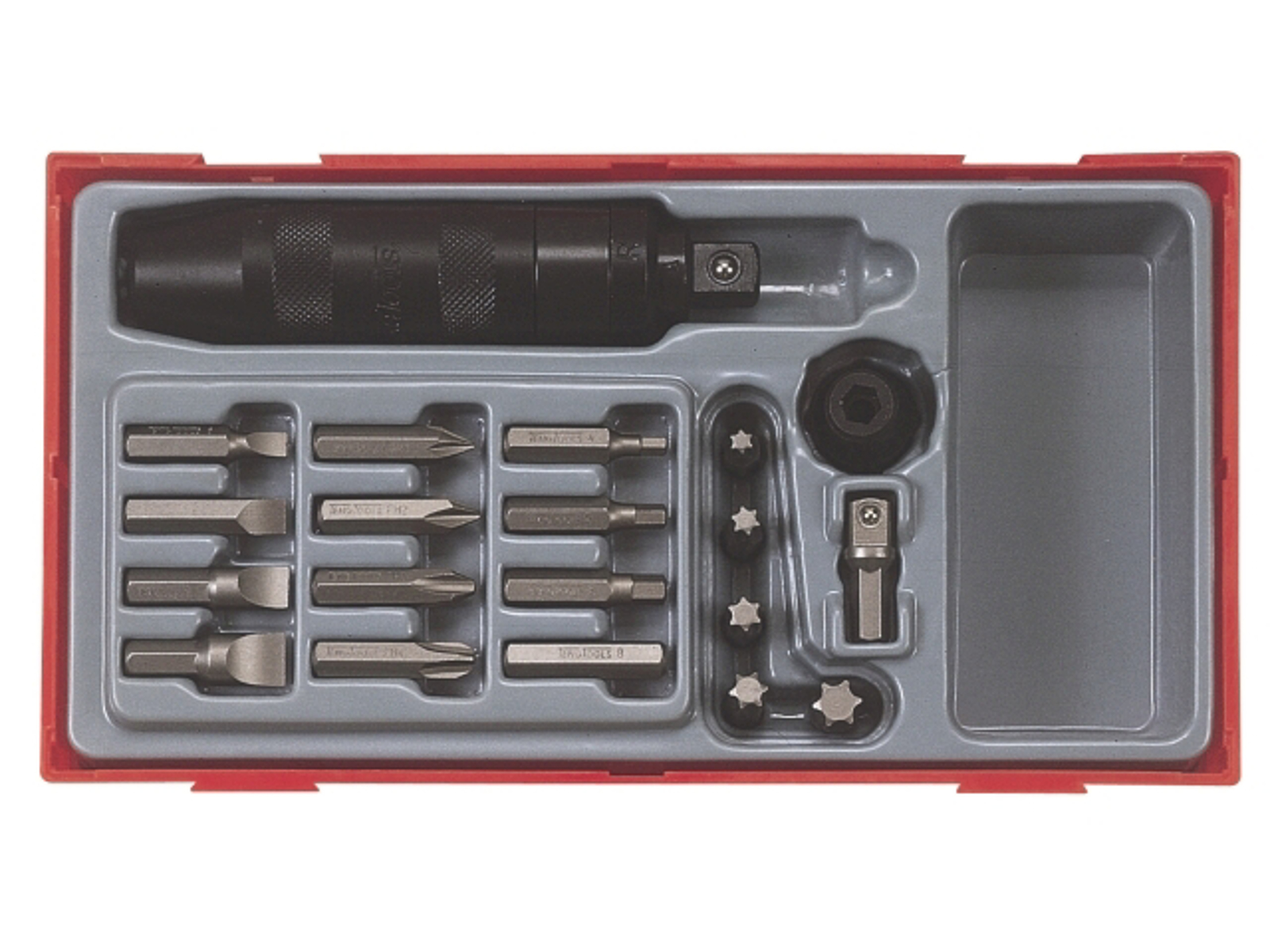 Teng Tools Industrikvalitet. Sæt indeholdende 1/2" slagskruetrækker, bits-top, adapter 5/16"- 3/8 "? samt 17 bits.Leveres i indbygningsboks af plast med aftageligt låg. Passer i Teng Tools værktøjskasser og montørvogne. |