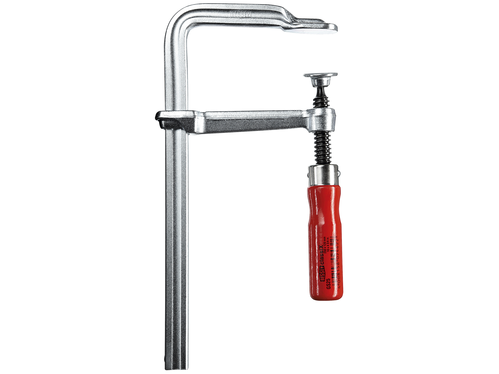 Helsmedet stålskruetvinge GZ classiX med hærdet glidebøjle og fast bøjle for fjedrende og elastisk spænding samt ergonomisk trægreb.