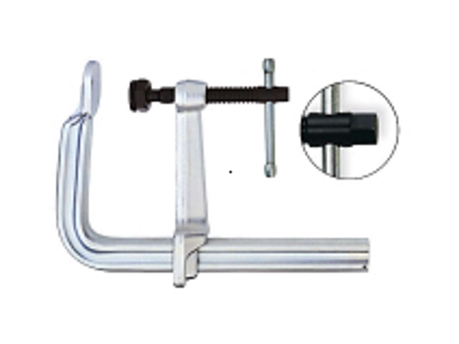 Kraftig helsmedet stålskruetvinge med lang levetid pga. varmebestandig specialtryksko med sinterstålindlæg, som kan vippes op til 35°. Model med sekskant 19 mm på spindelenden. Skinnestørrelse 40×20 mm. Fås i flere dimensioner.