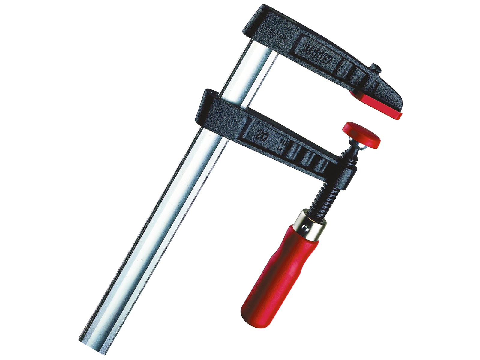 Blødstøbt skruetvinge med ergonomisk trægreb, tryksko der kan skiftes uden brug af værktøj (fra 80 mm udladning), beskyttelseskapper på spændefladerne, stabil højprofilskinne med riller samt Bessey rutschsikring (fra 80 mm udladning). Fås i flere varianter.