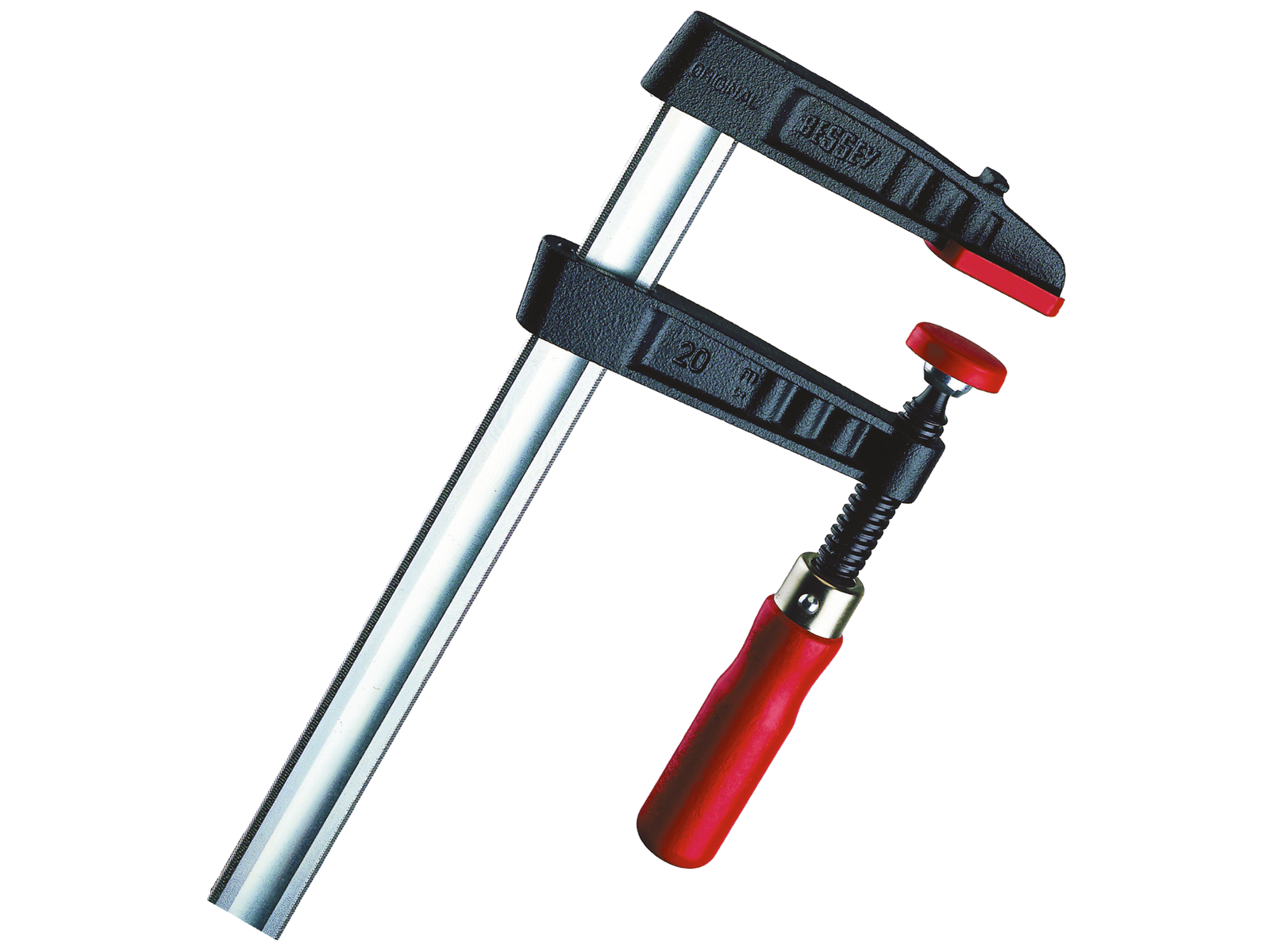 Blødstøbt skruetvinge med ergonomisk trægreb, tryksko der kan skiftes uden brug af værktøj (fra 80 mm udladning), beskyttelseskapper på spændefladerne, stabil højprofilskinne med riller samt Bessey rutschsikring (fra 80 mm udladning). Fås i flere varianter.