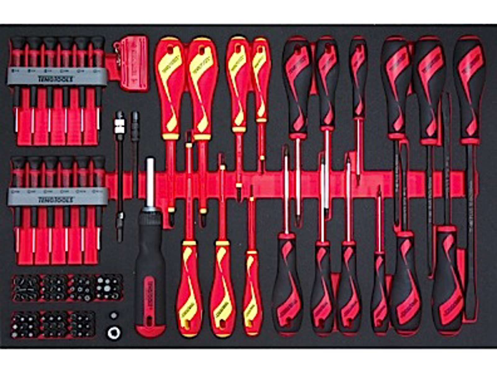 Leveres i Teng Tools’ nye opbevaringssystem udfræset i tre forskelligt farvede lag EVA-skumplast.