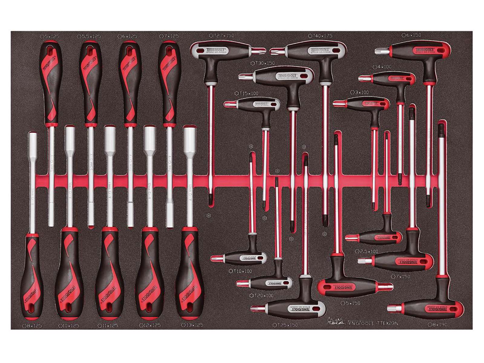 Værktøjssæt med 23 dele indeholdende topnøgleskruetrækkere samt unbrakonøgler og TX-nøgler med T-greb. Værktøjet ligger i EVA-skum i tre forskelligt farvede lag. Passer i Teng Tools’ værktøjskasser og montørvogne.