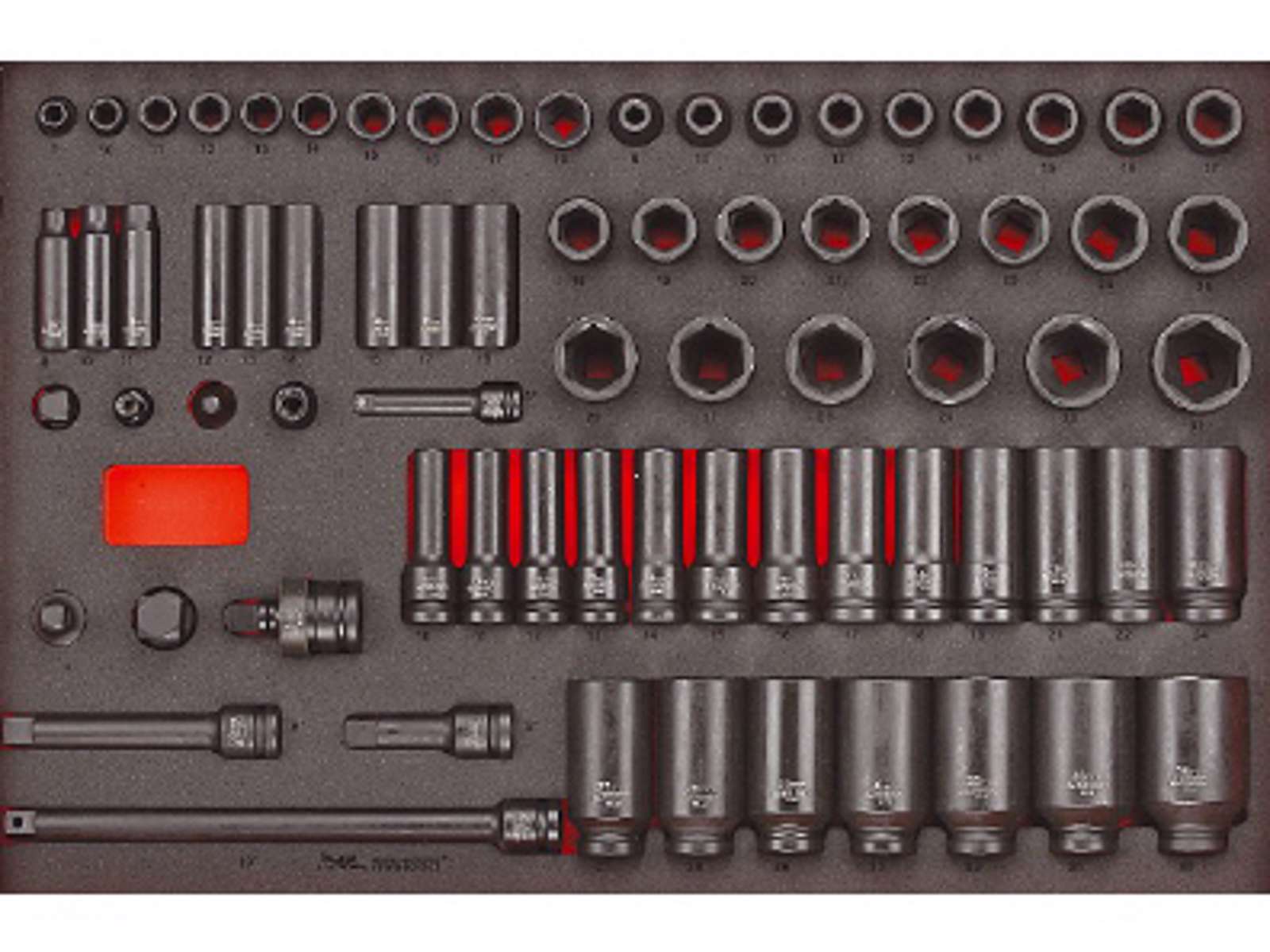 Leveres i Teng Tools’ nye opbevaringssystem udfræset i tre forskelligt farvede lag EVA-skumplast.