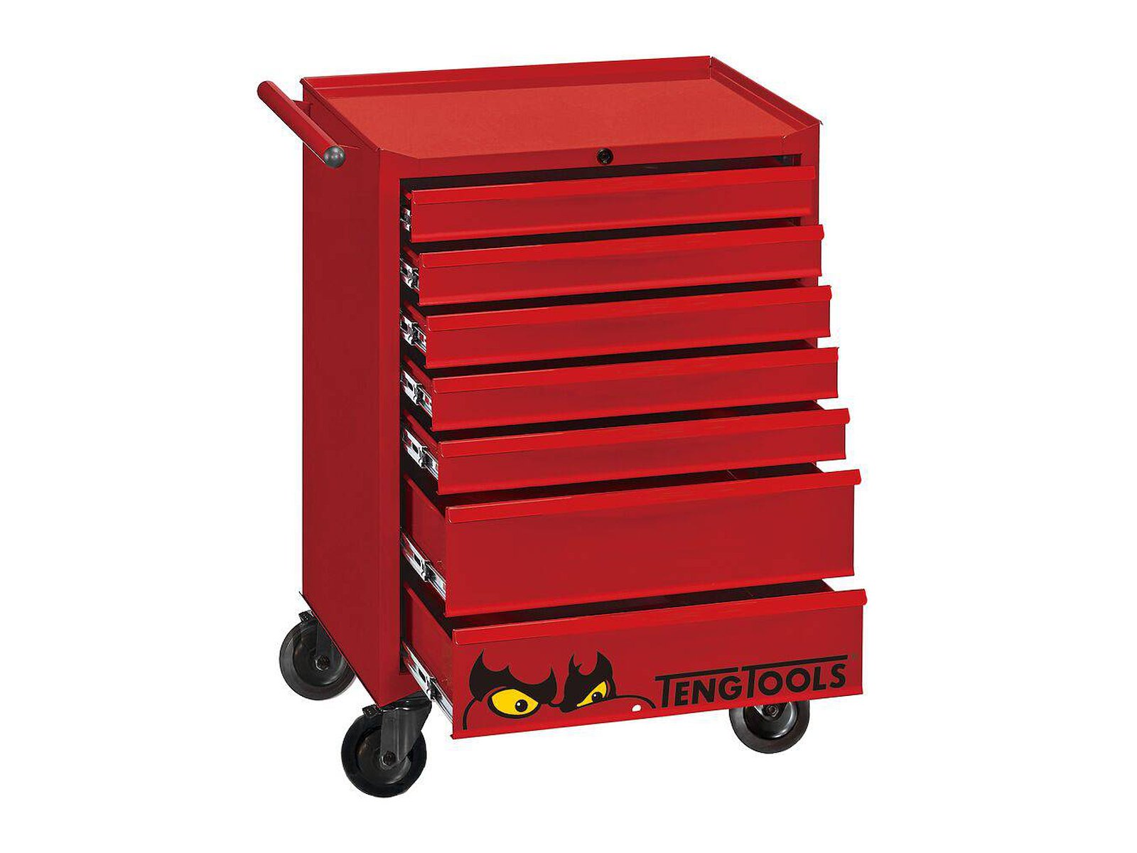 Værktøjssæt med 217 dele i 27″ Classic montørvogn. Værktøjet ligger organiseret i præcisionsudskårne, trefarvede EVA-skumindlæg fordelt i de fire skuffer. 1/4″, 3/8″ og 1/2″ firkantede fæstesystemer med skraldenøgle med 72 tænder. Regulære og dybe metriske toppe (4 MM til 24 MM). Omfatter forlængerstænger, kardanled, adaptere, ringgaffelnøgler, skiftenøgler og kraftig gribetang med buede kæber. Værktøj til almene formål: hammere, måleværktøj, mejsler, dorne, hobbykniv og nedstryger. Komplet skruetrækkersæt med 1/4″ bitsskruetrækker med skralde og omfattende udvalg af bits. Hex-nøgler med kuglehoved (metrisk og AF) samt TX-nøgle. Montørvogn af kraftigt stål med rød pulverlakering som finish. Syv fuldt udtrækkelige skuffer med en kapacitet på 30 KG hver. Kraftige, formonterede 5″ × 2″ kuglehjul (to faste og to drejelige med bremse) og metalhåndtag i siden. Integreret nøglelås. Kompatibel med Teng Tools Tool Control-system.