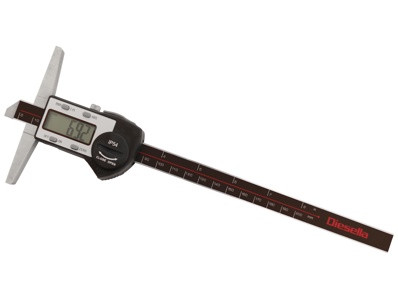 Digitalt dybdemål med omskifter fra mm til tommer, ABS og nulstilling. Desuden udstyret med mini-USB udgang. Broens længde er 100 mm. IP54. Aflæsning 0,01 mm. Leveres i plastkasse (inkl. 1×CR2032 batteri).