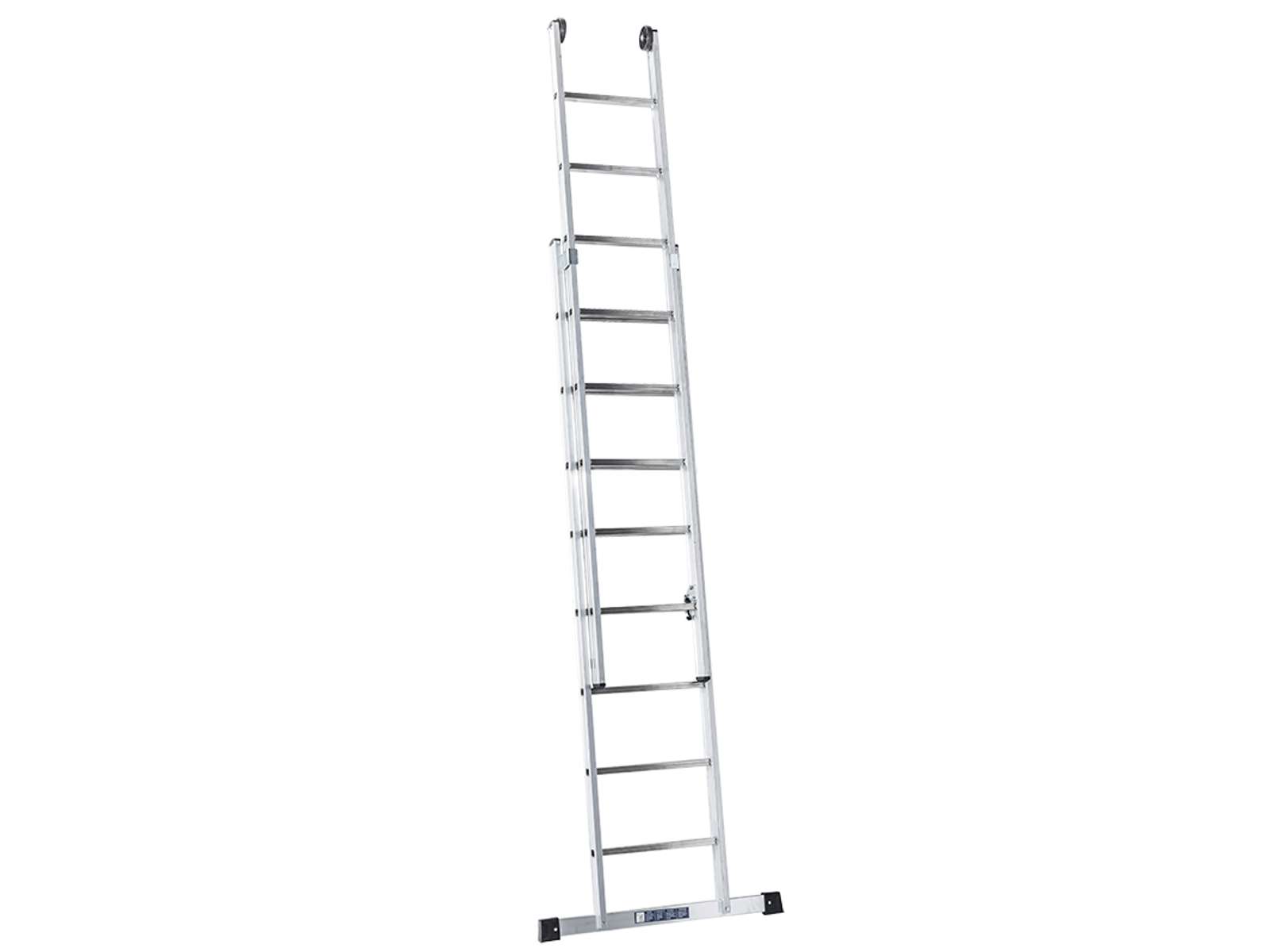 JUMBO Proff Skydestigen har kraftige alu-vanger og 35 mm brede trin. For lettere udskydning er der montereret et tophjul foroven.